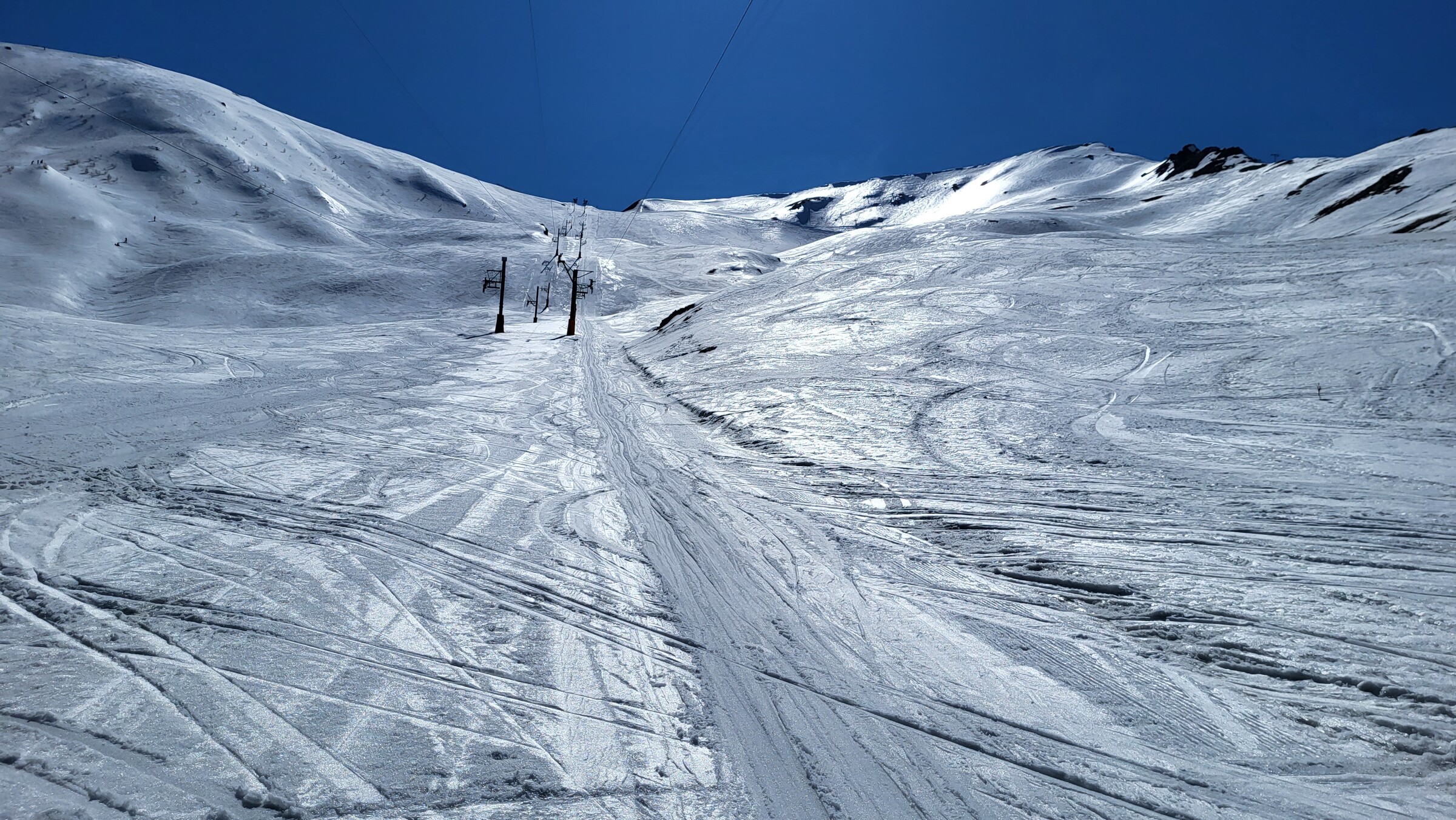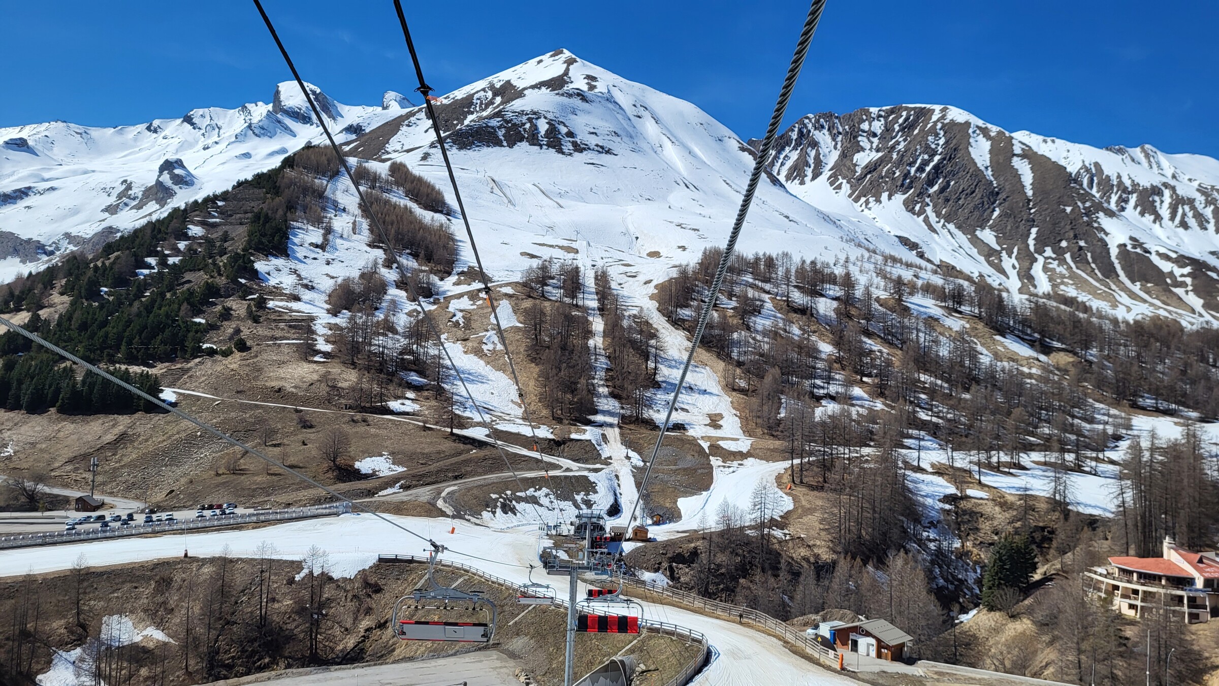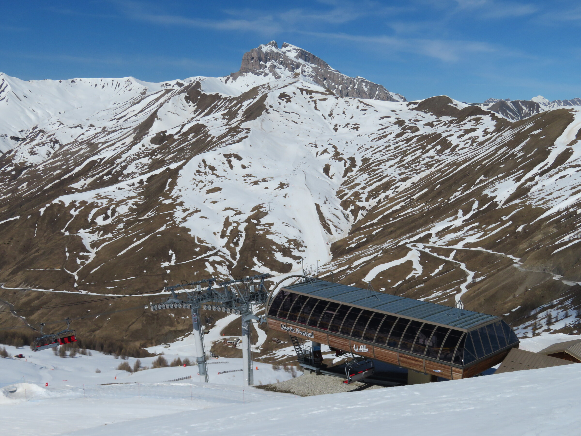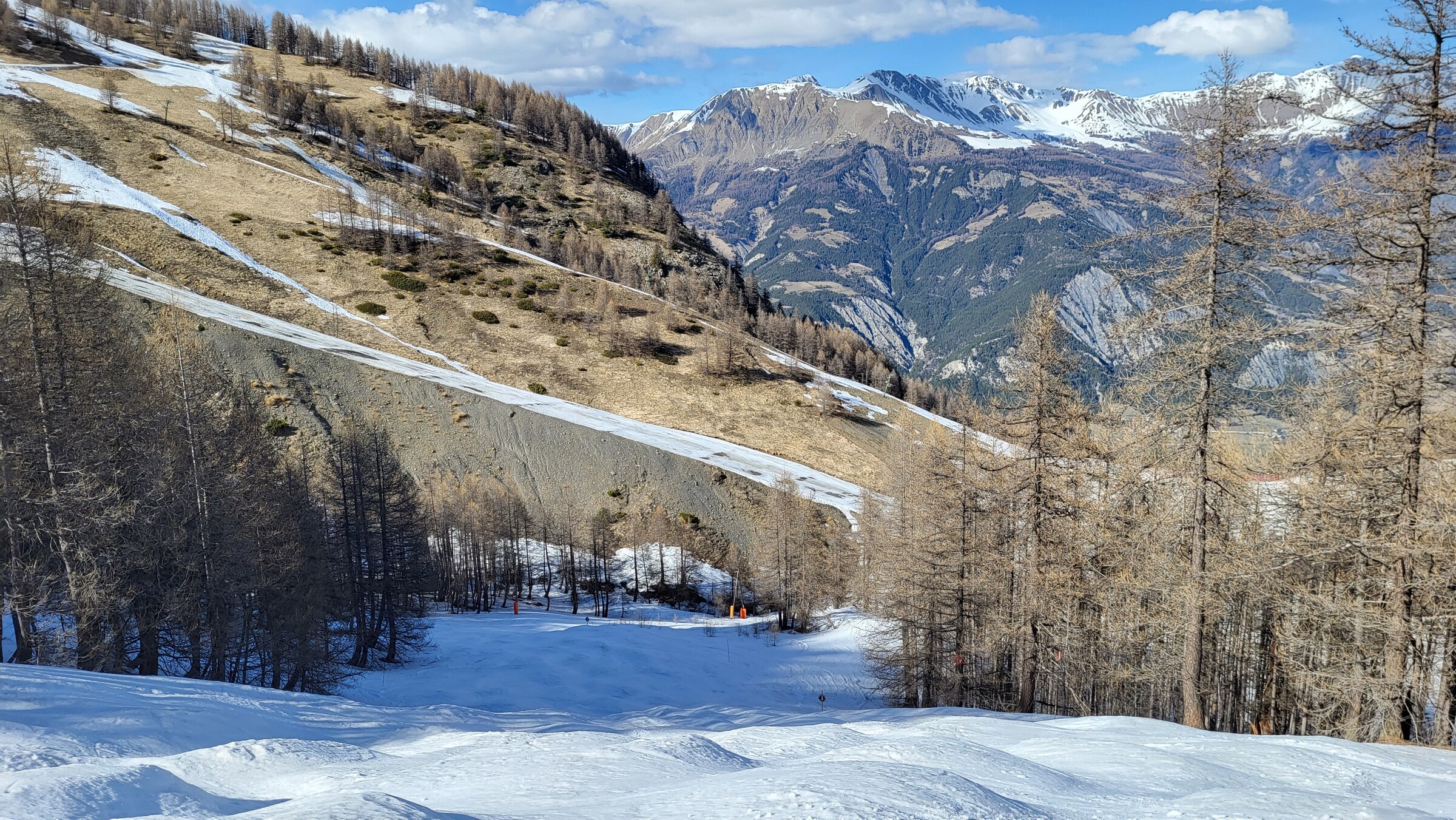 > Heute war dafür der SL Tardée geöffnet (rechts im Bild), auch wenn die beiden direkten Abfahrten bereits nicht mehr ausreichend Schnee hatten