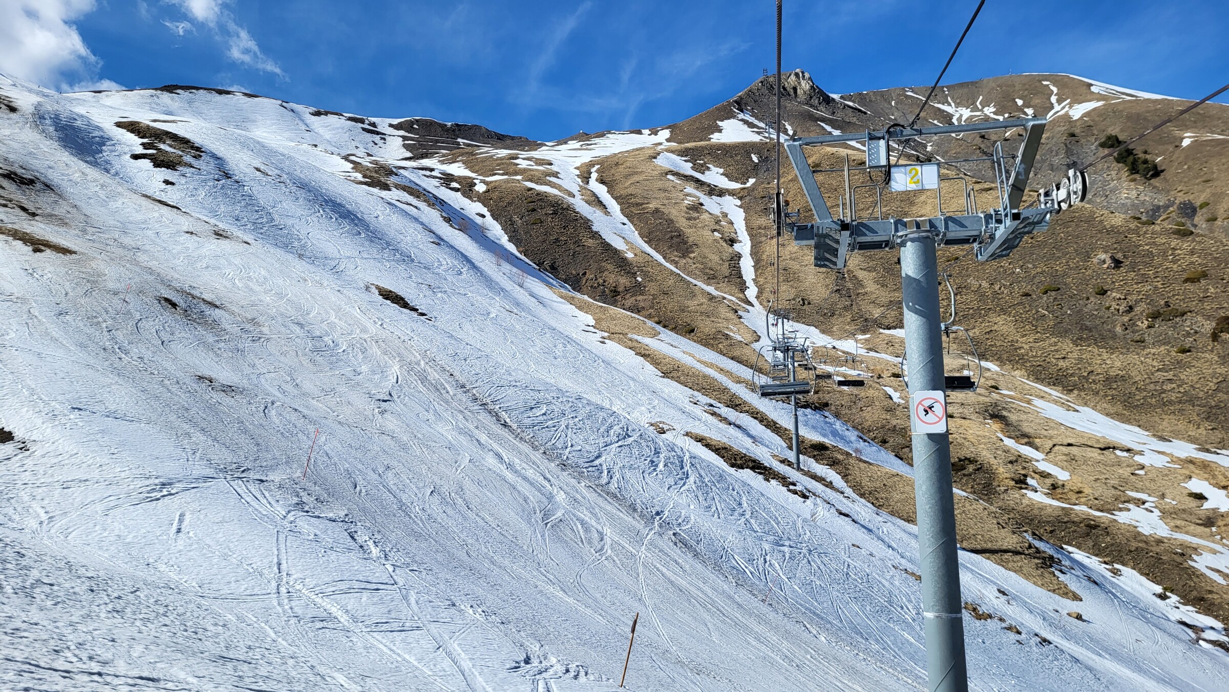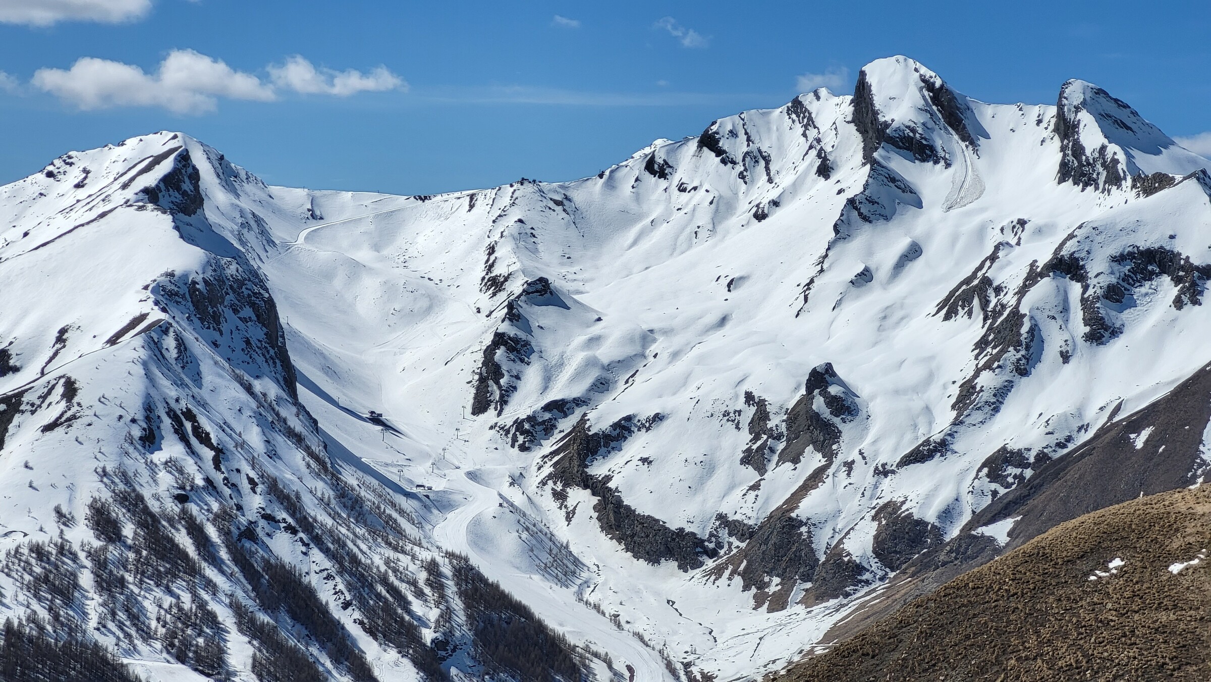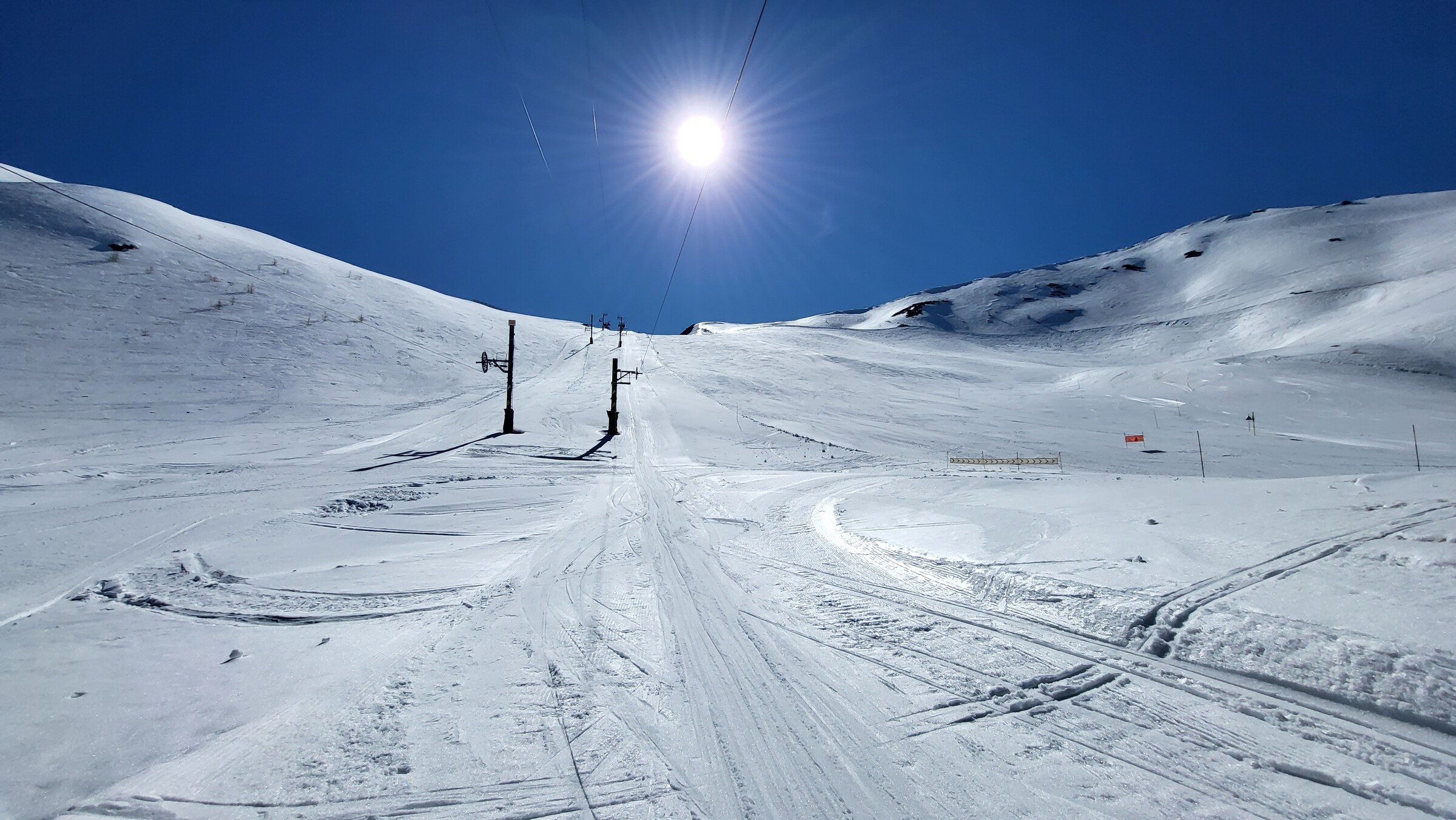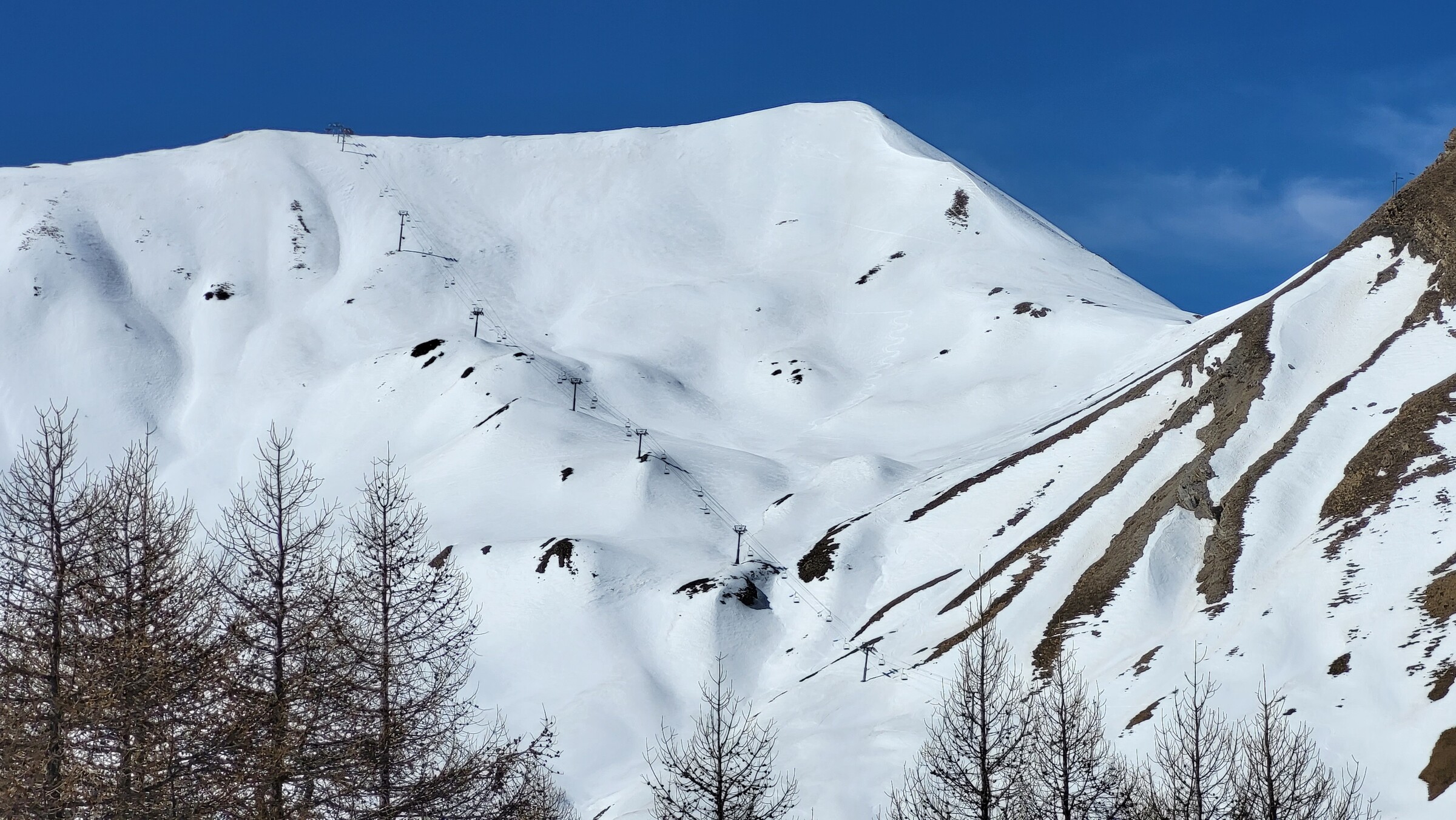 > Heute war dafür der SL Tardée geöffnet (rechts im Bild), auch wenn die beiden direkten Abfahrten bereits nicht mehr ausreichend Schnee hatten