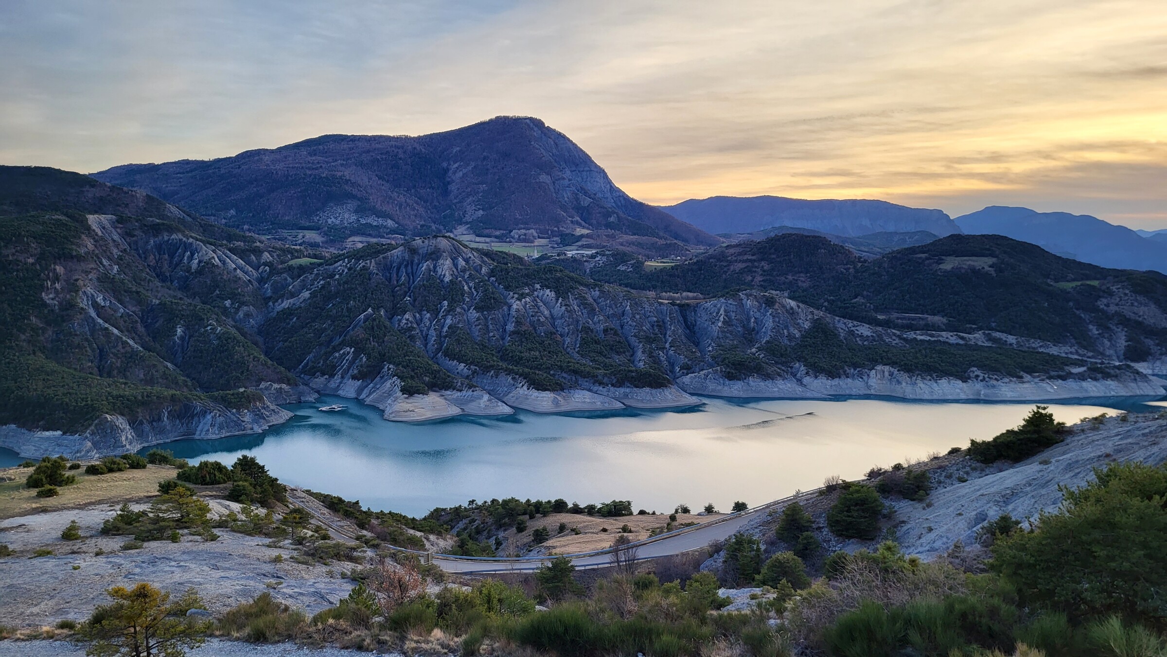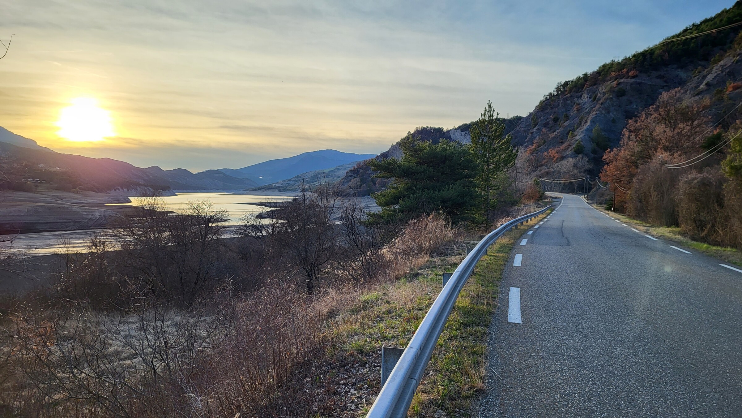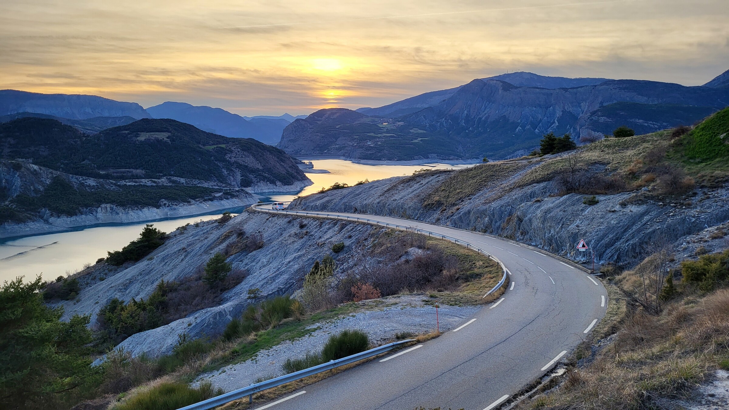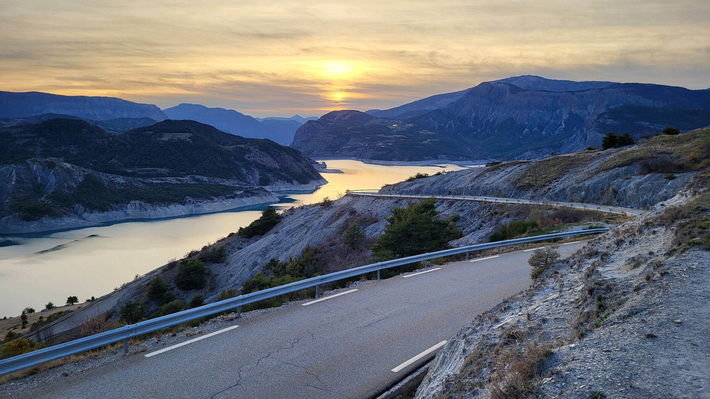 > Dadurch kam ich passend zum Sonnenuntergang am Lac de Serre-Poncon vorbei, über die ruhige und aussichtsreiche Straße auf der Ostseite