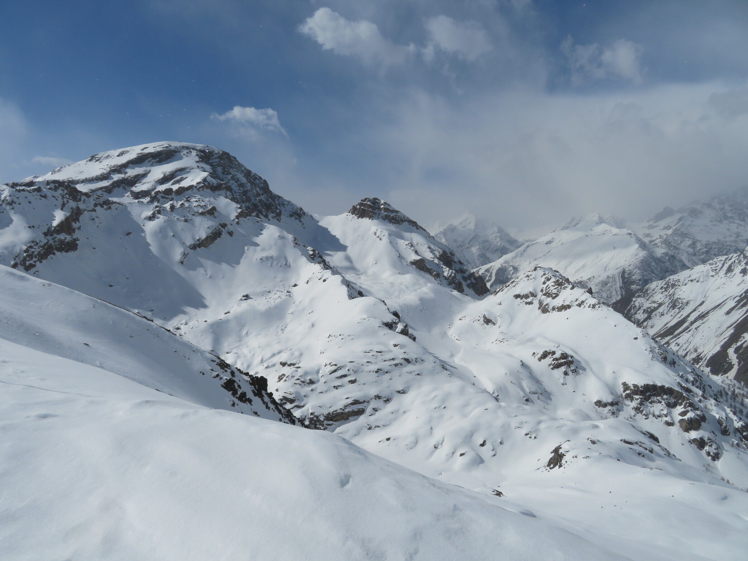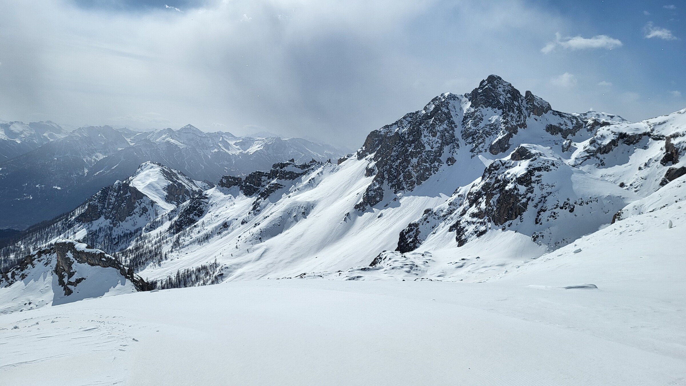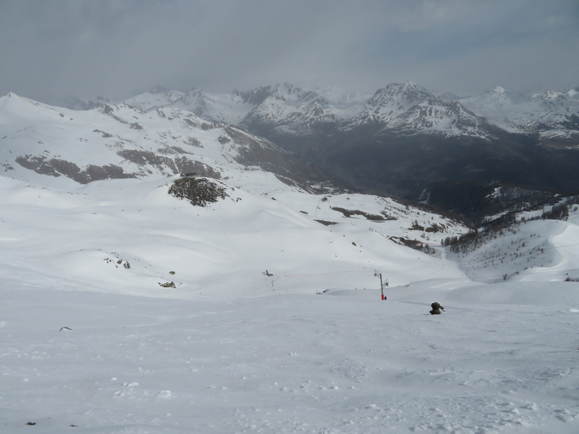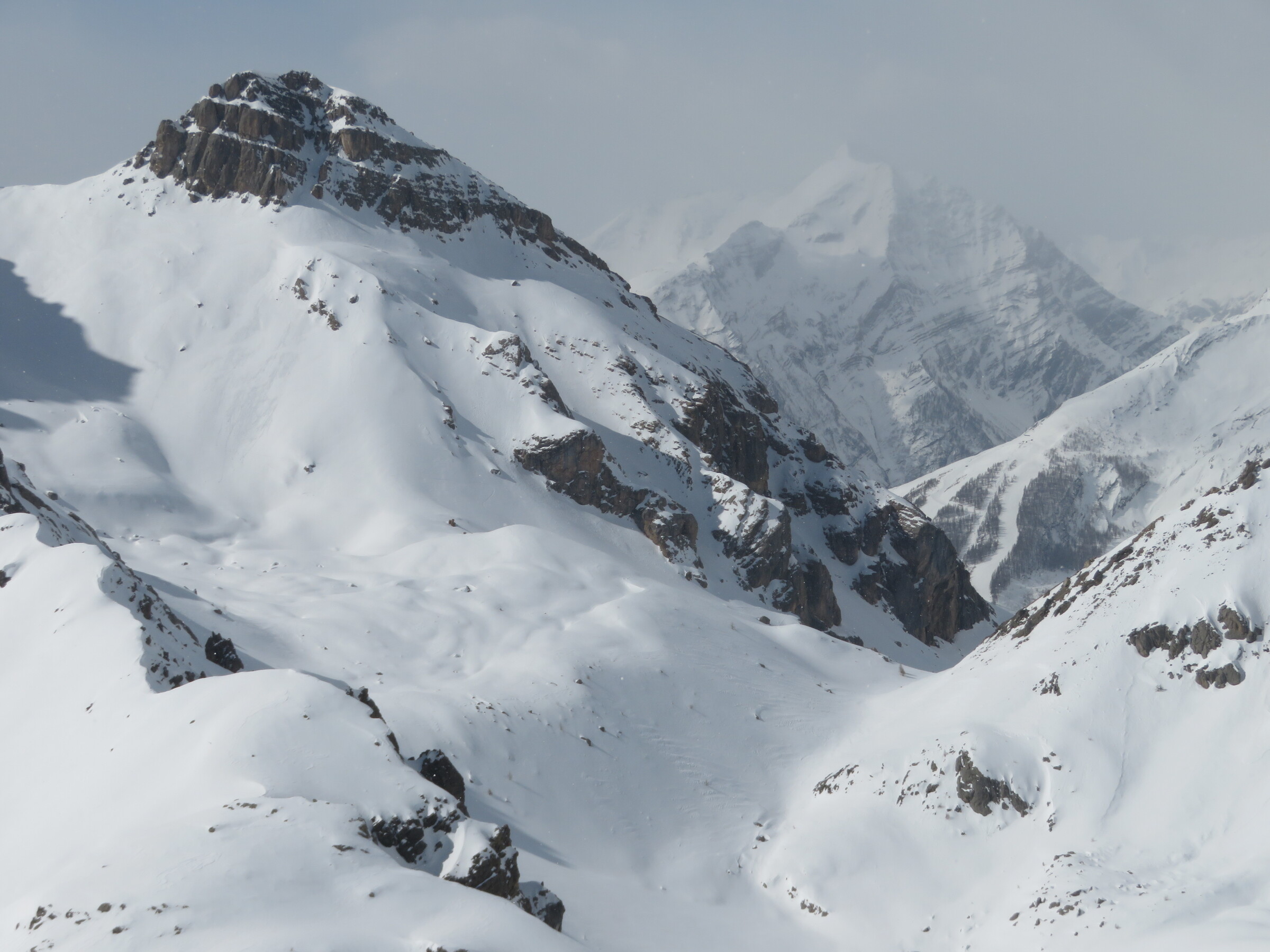 > Blick in die tollen Geländekammern am SL Eychauda. Leider ist an diesem Tag der Schnee (auf den Pisten und im Gelände) etwas klebrig oder windgepresst