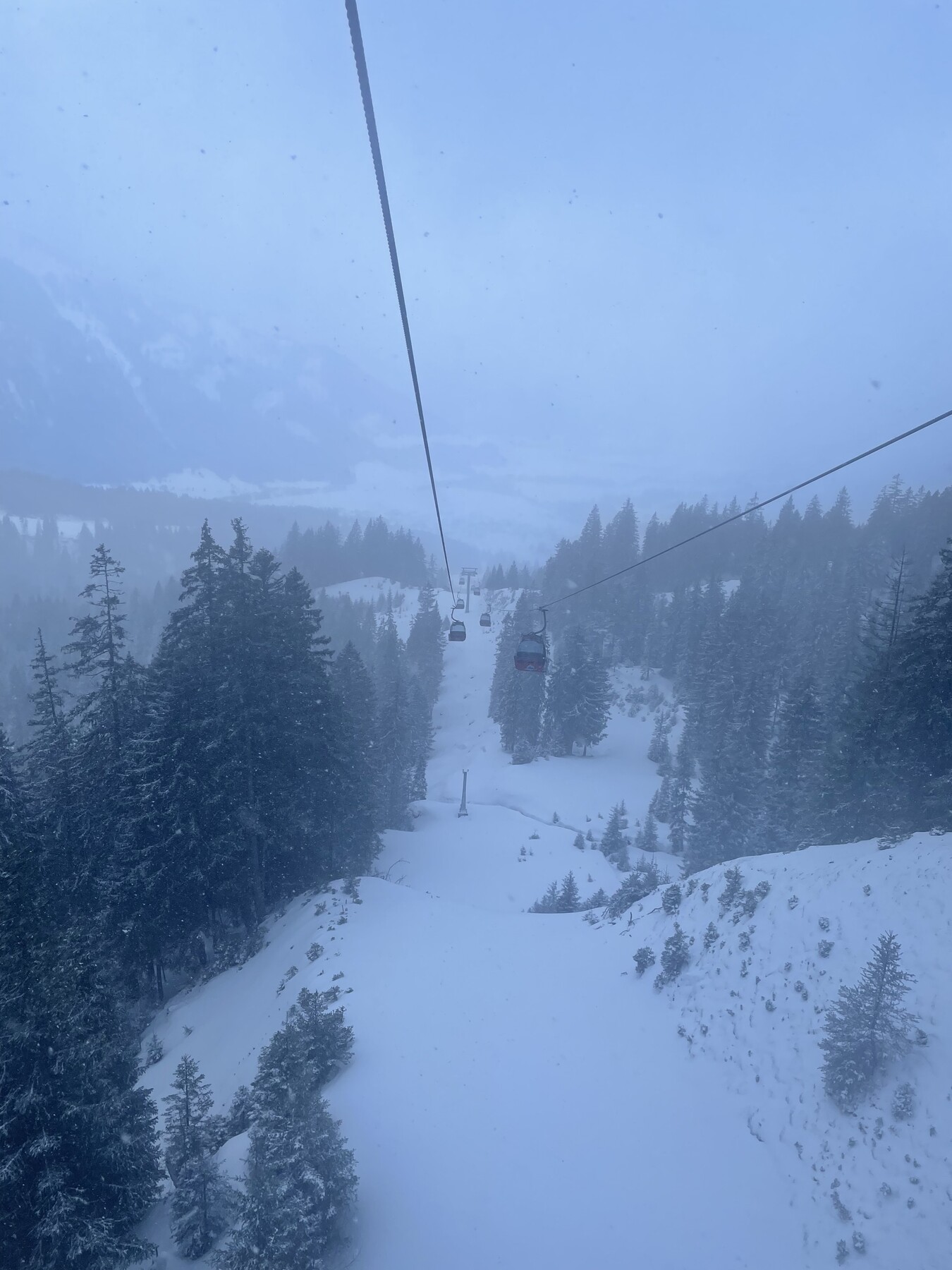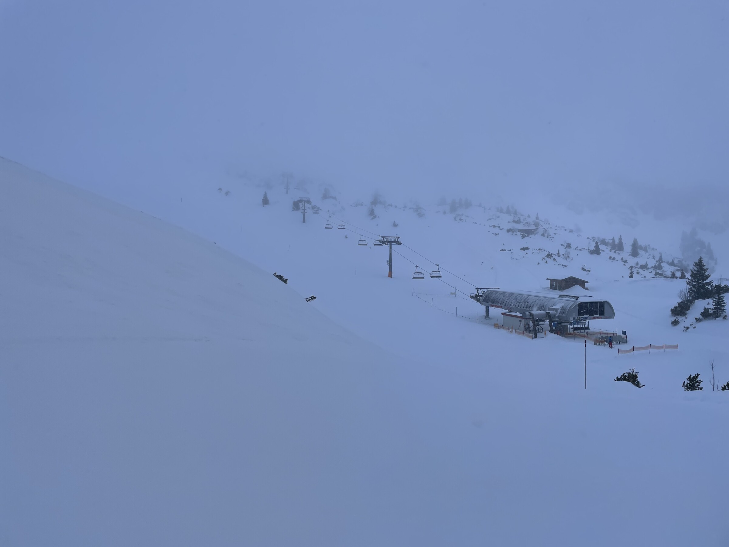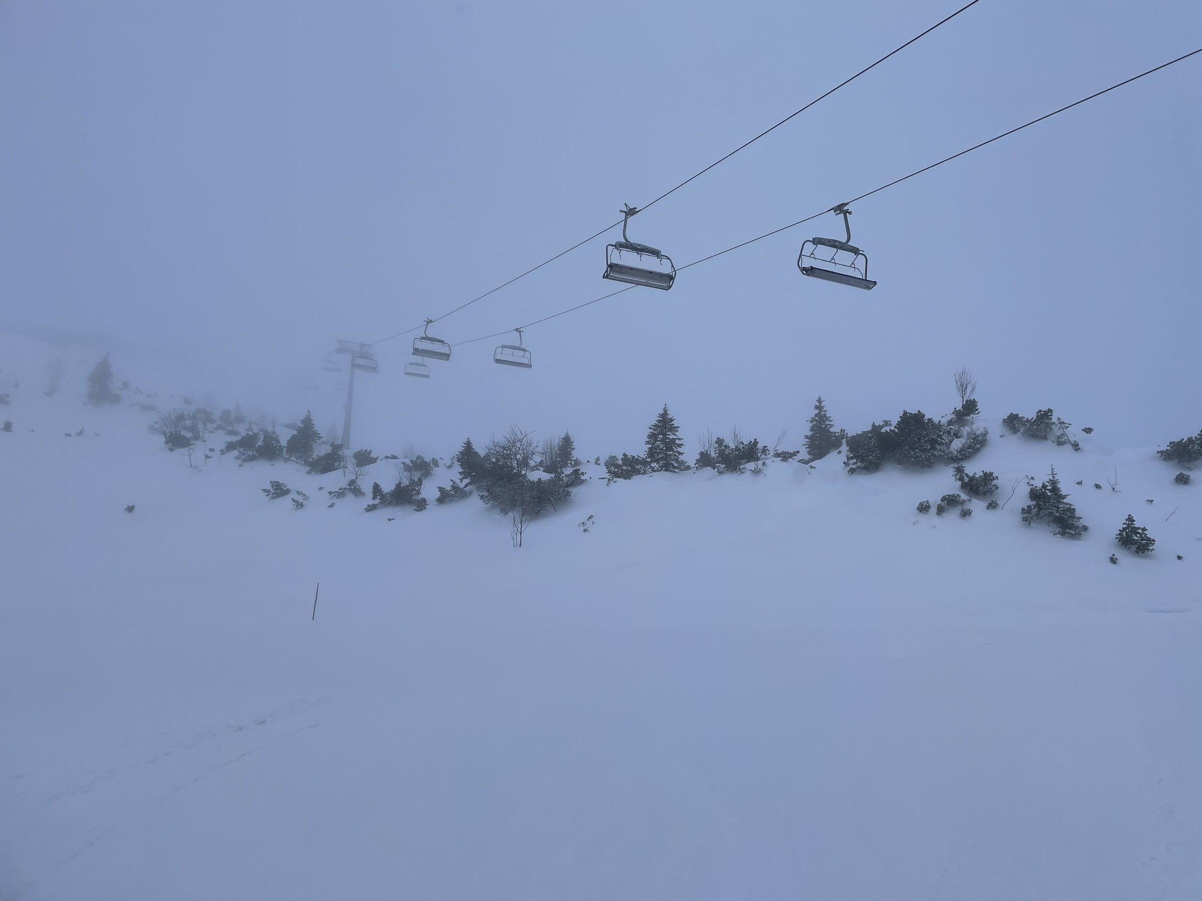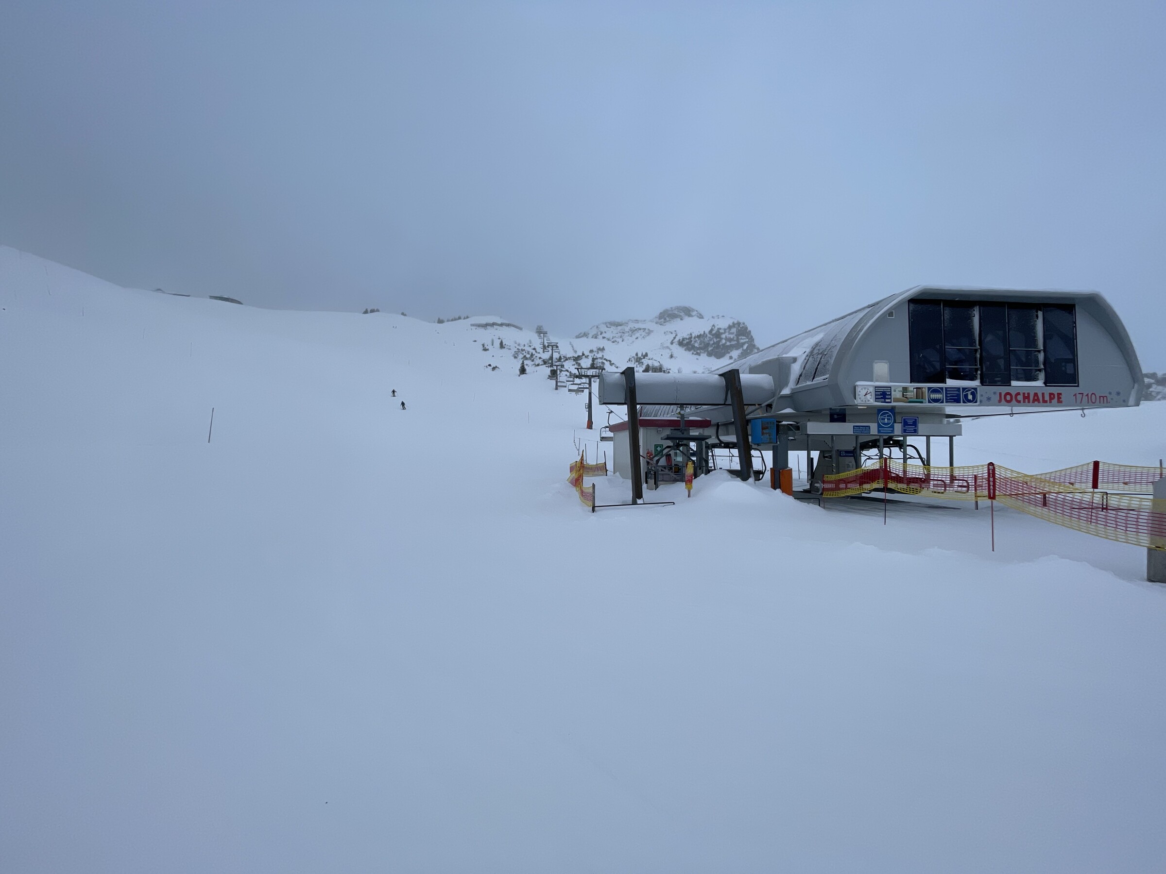 Als wir dann um 09:45 in Grän angekommen sind, war es schon recht windig. Wir dachten eigentlich, dass der Skibetrieb dort auch jeden Moment eingestellt wird. Wider erwarten, war das Gebiet dann aber doch den ganzen Tag geöffnet. Morgens war es neblig und die Sicht entsprechend mittelmäßig. Gegen Mittag und vor allem am Nachmittag klarte es aber immer mehr auf. Den Wind und die Böen merkte man deutlich. Sowohl die Gondel als auch der Sessellift waren davon aber unbeeindruckt.