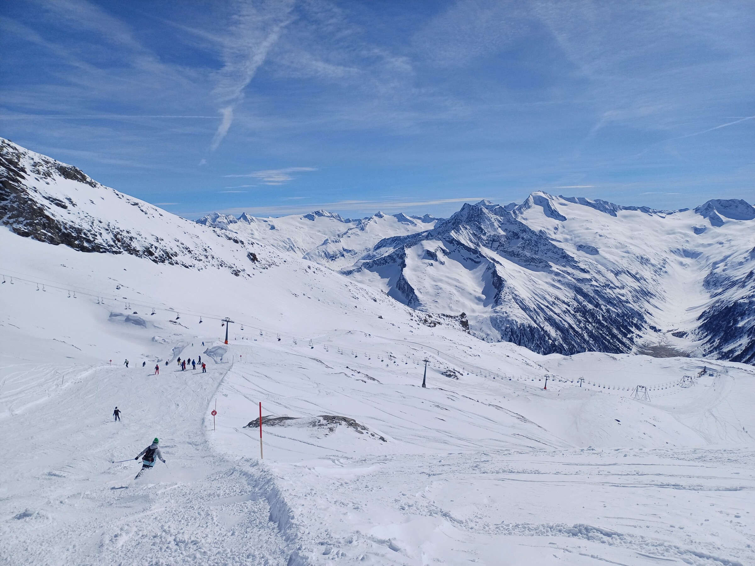 Im Tuxertal ist gefühlt schon Ende April, die Wiesen sind richtig grün. Ein seltsam wirkender Streifen in weiß geht noch zur Rastkogelbahn von der Eggalm aus. Im Zillertal könnte auch schon Ende Mai sein:
