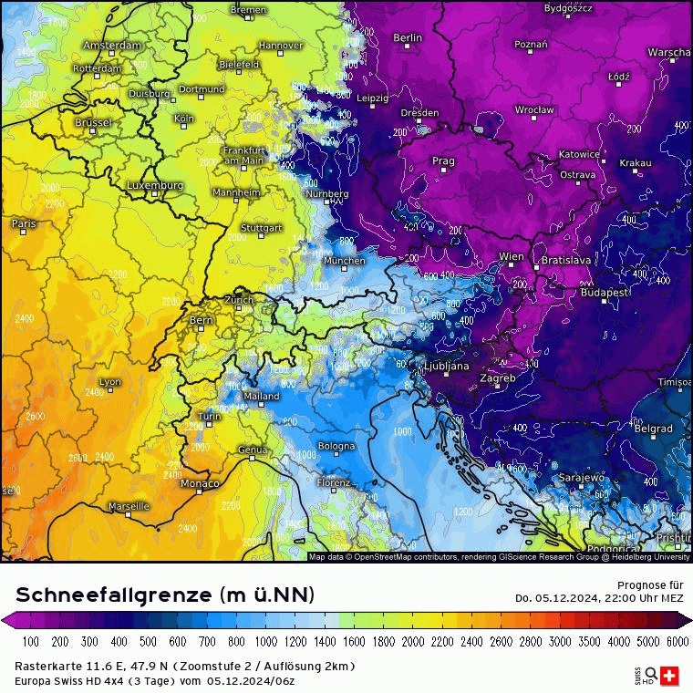 Wo hast Du denn die 1200m her? Guck mal da und dann auf die Zeitangabe in der Animation achten. Dann sieht man, dass der Arlberg die ganze Nacht hindurch deutlich gelb eingefärbt ist. Eigentlich soll die SFG heute Morgen beginnen zu sinken. Mal schauen ob das passen wird, also der Regen die Nacht passteArlbergfan hat geschrieben: 06.12.2024 - 08:43 Aktuell Regen - nix mit Schneefallgrenze um 1.200 Höhenmeter.
