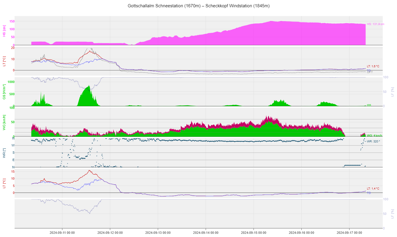 Habs mal geprüft, gem. Messstation (www.lawis.at) sinds am Gamskar auf 1986m aktuell 61,5 cm und auf der Passhöhe auf 1770m sind es 41,6 cm