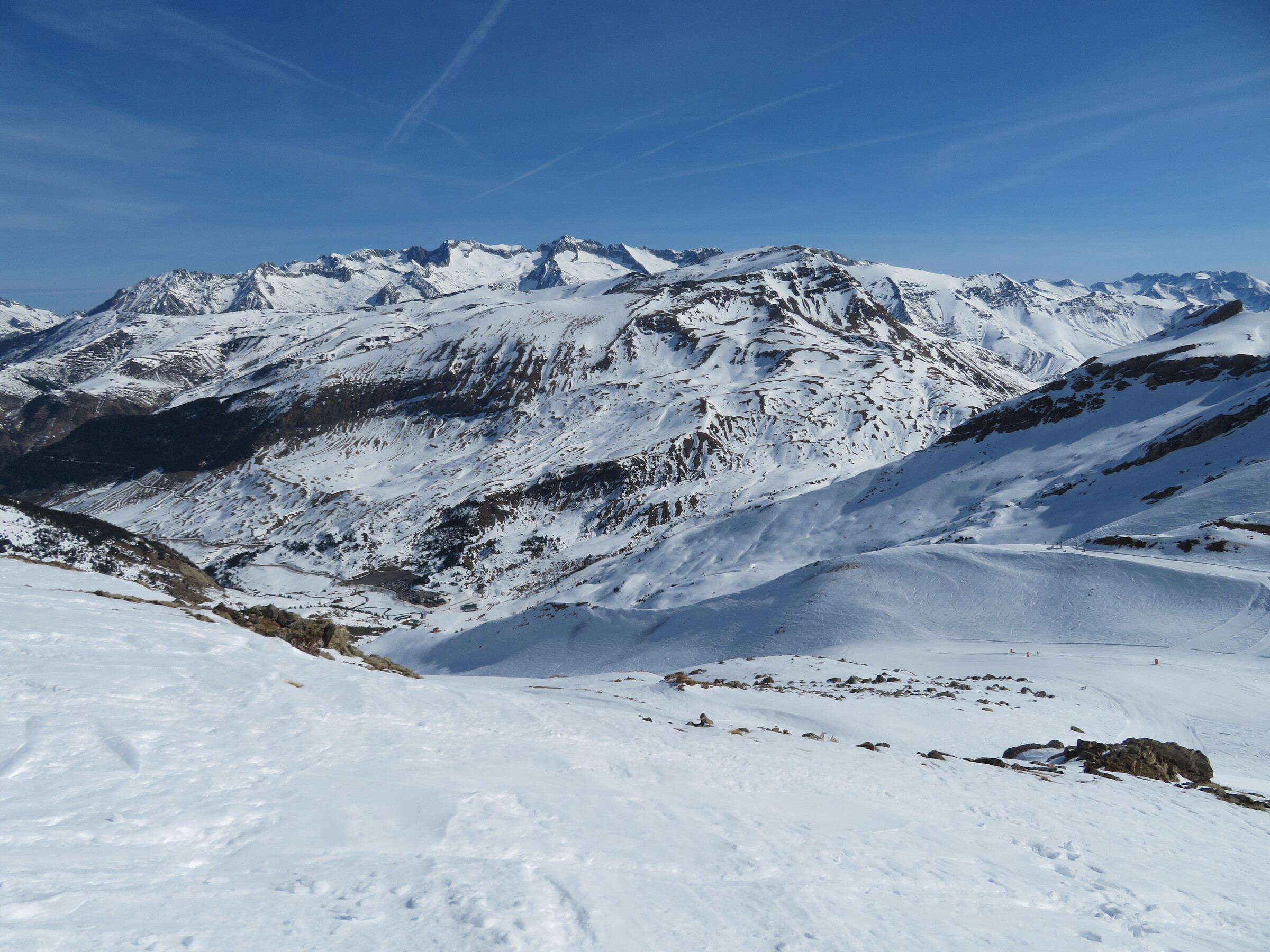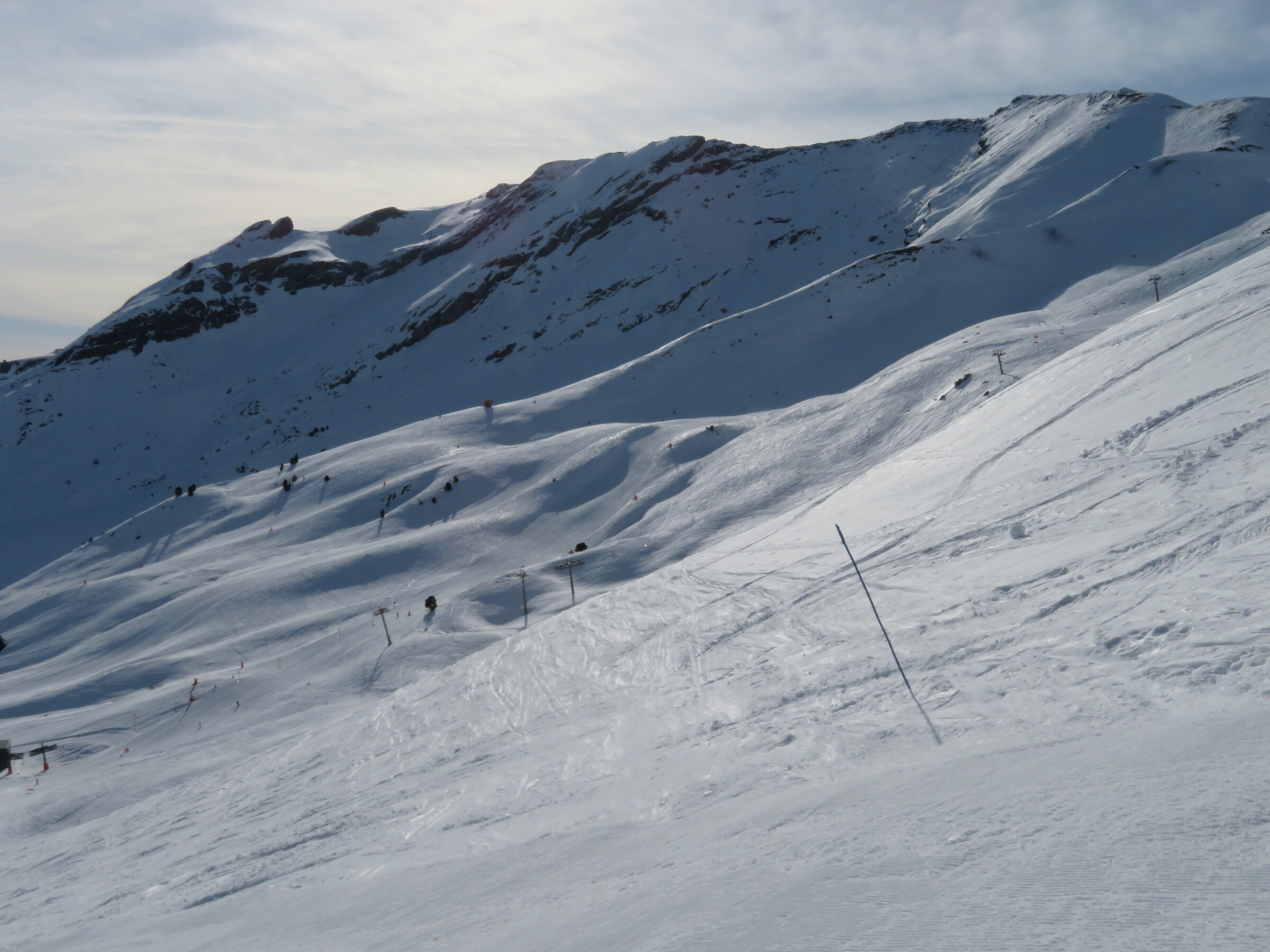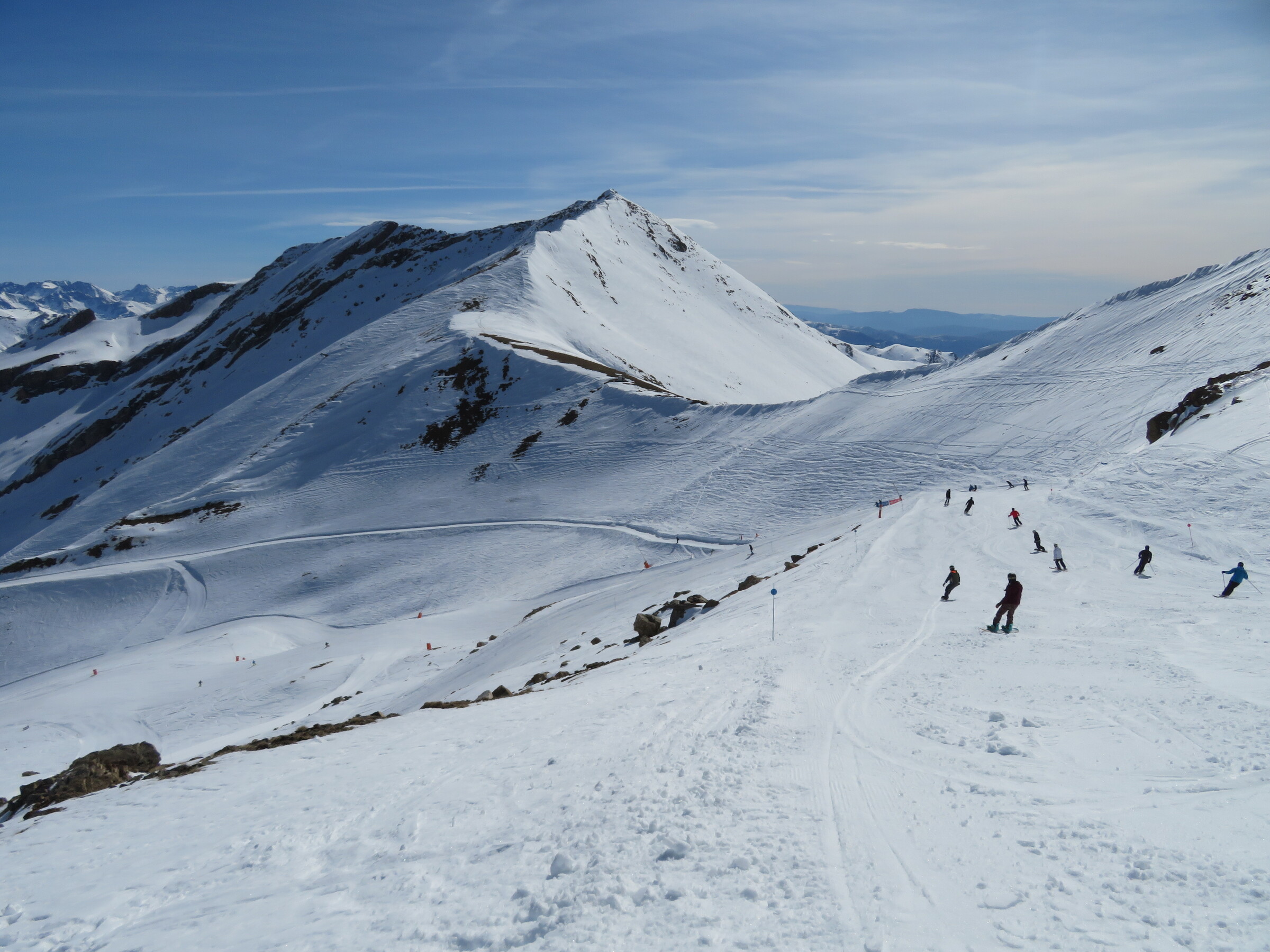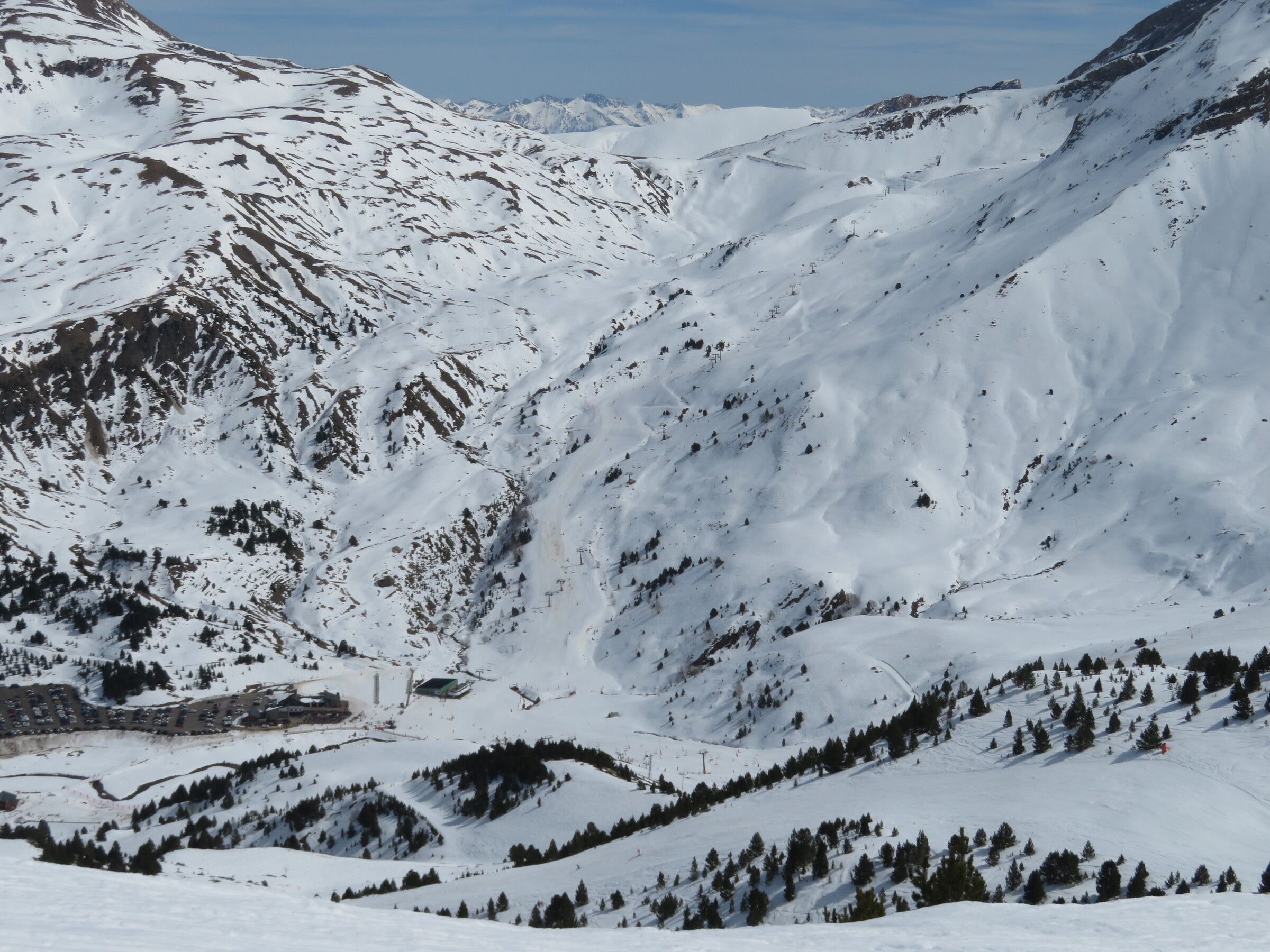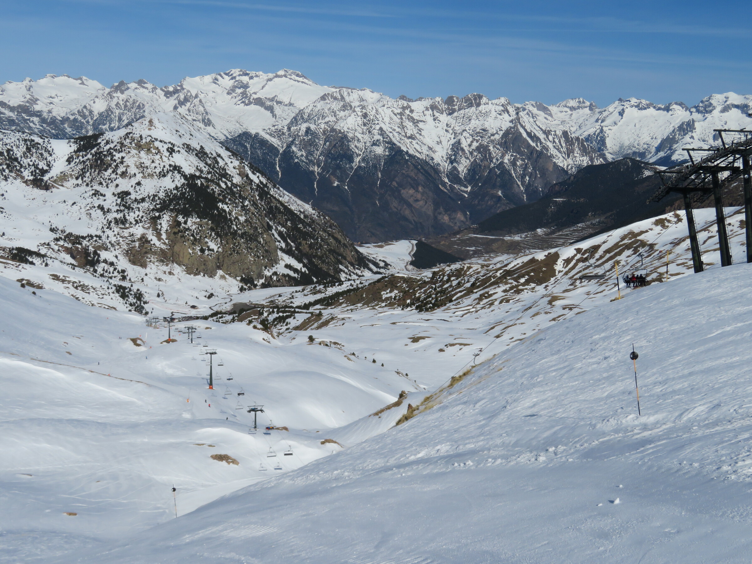 Eine der Überraschungen auf dieser Reise: Erstaunlich abwechslungsreich und weitläufiger als erwartet. Dazu dank der hohen Nordhänge der letzte Tag mit gutem, pulvrigen Schnee (bevor Hitze und Saharasand immer stärker würden) und dank der vielen kuppelbaren Lifte auch einige Wiederholungen möglich. Der beste Pistentag meines Aufenthalts in Spanien!