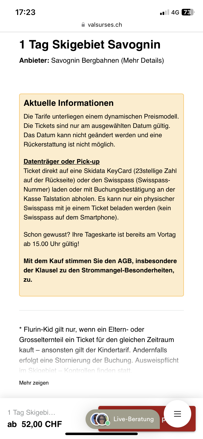 In Savognin ist die Tageskarte ebenfalls am Vortag ab 15:00 gültig