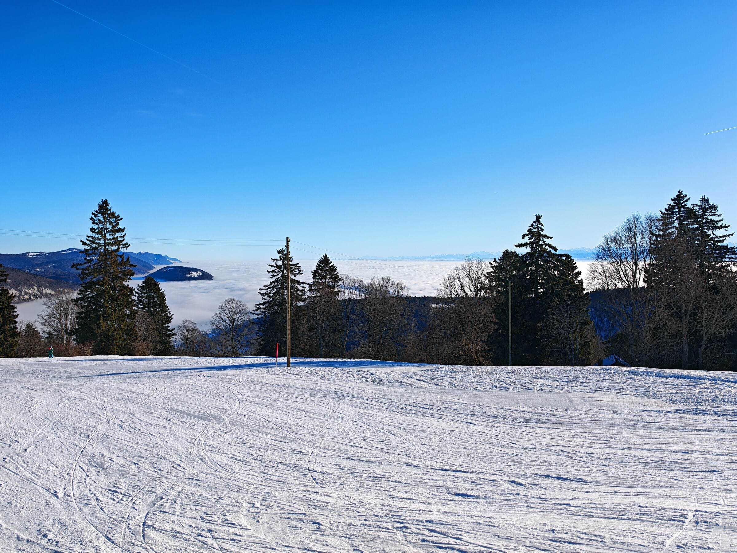 Im Nachhinein war es wohl die falsche Entscheidung, zu versuchen, in Bugnenets-Savagnières alles mitzunehmen, denn mein Highlight des Tages war ohne Zweifel Crêt du Puy! Im oberen Bereich abwechslungsreiche Pisten mit nur selten Boden- und keinem Steinkontakt, im unteren Bereich perfekte Carvinghänge und viel weniger los, vergleichbar mit Tramelan. Die Schwarze war gesperrt, sah aber weniger dramatisch als die meisten Pisten in Bugnenets-Savagnières aus. Alles andere war offen. Der Berg selbst ist weniger markant als in Bugnenets, dafür hat man einen besseren Fernblick auf das Nebelmeer.