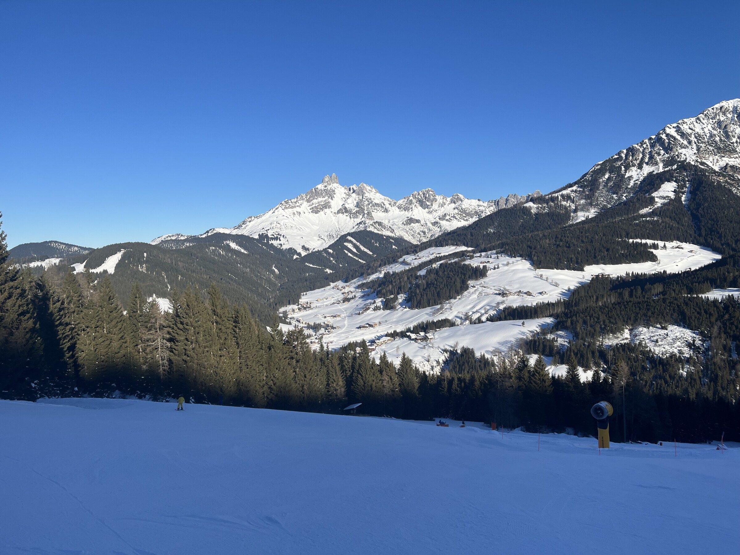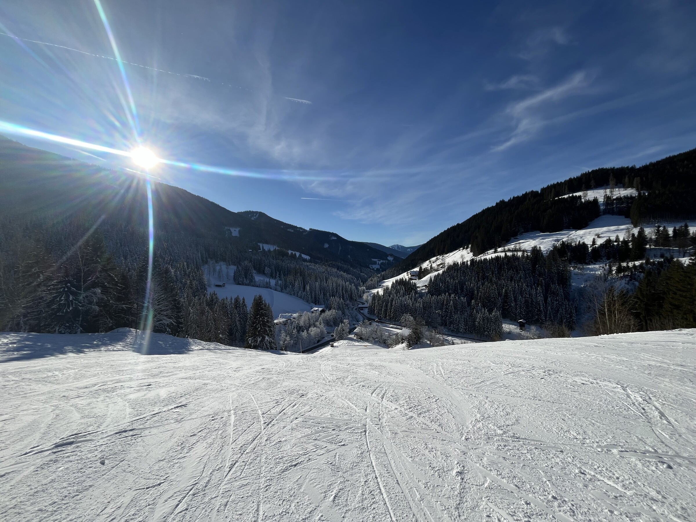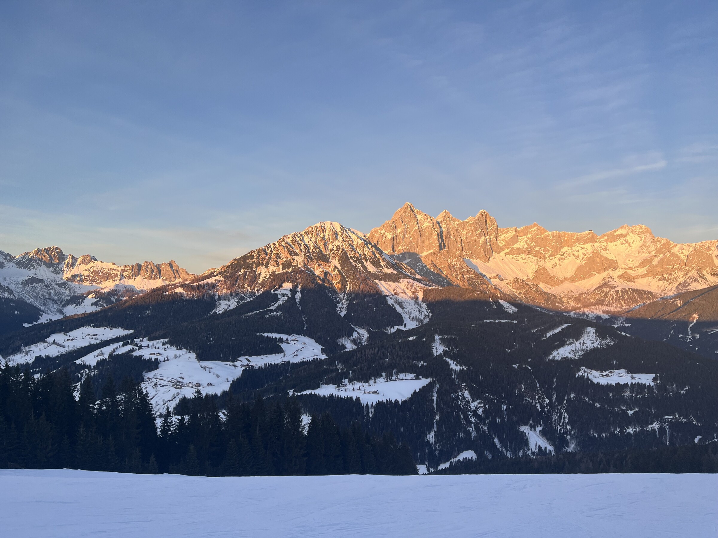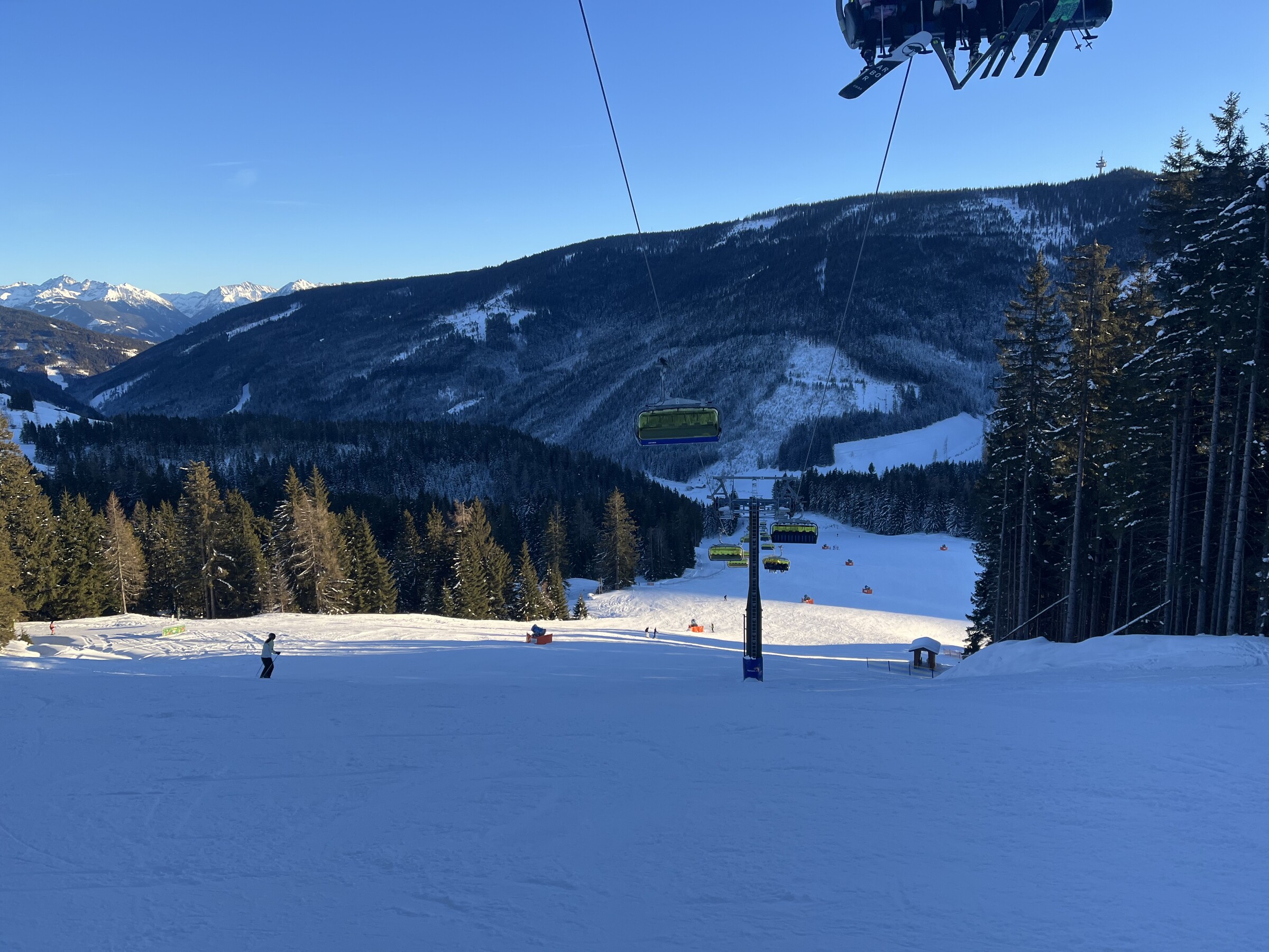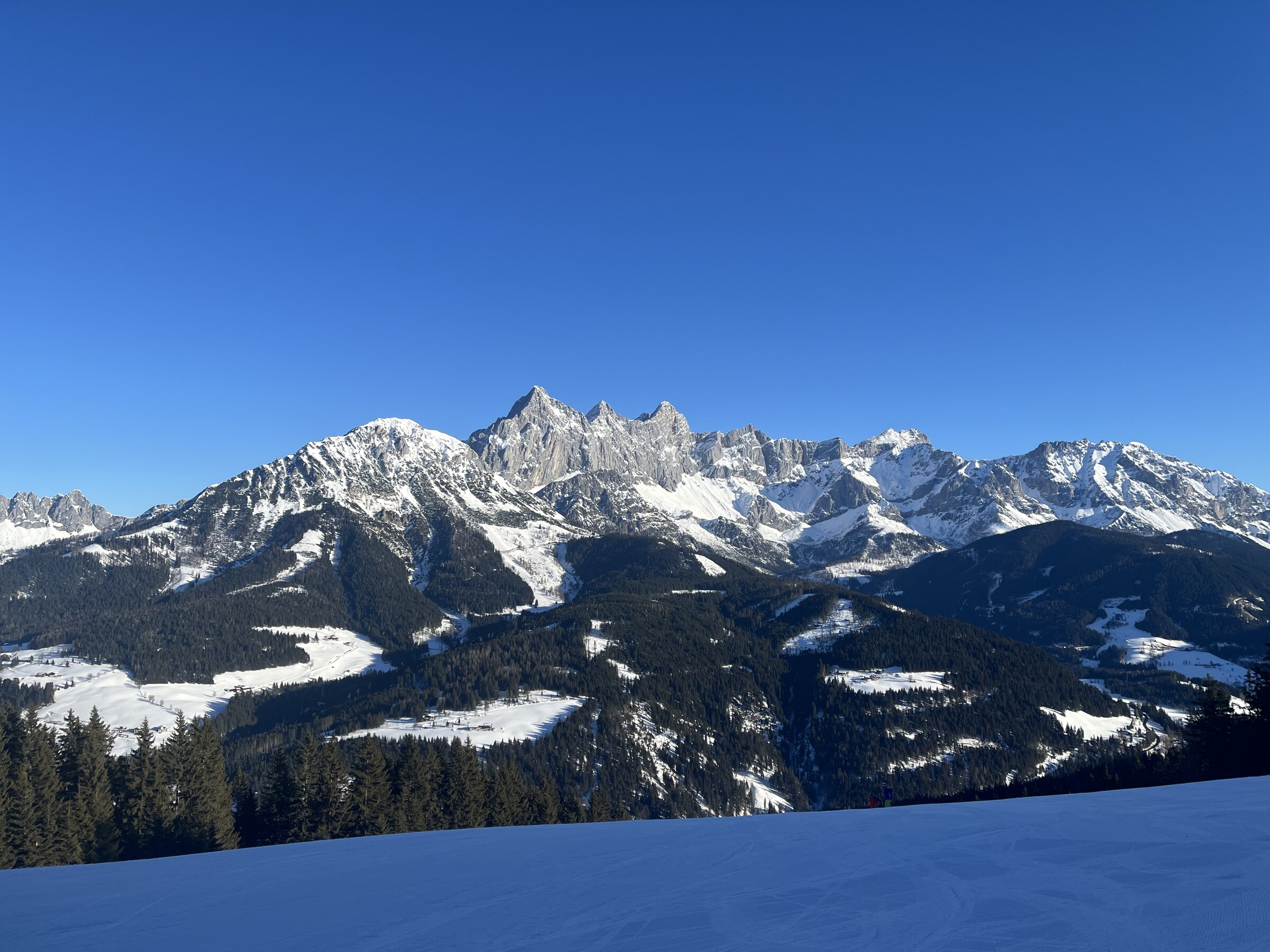 Hier noch einige Bilder von der Silvesterwoche aus Filzmoos. Geöffnet war alles bis auf die schwarze Piste und die untere rote Piste am Großberglift. Bis einschließlich Neujahr perfektes sonniges Wetter, danach dann bewölkt und etwas Neuschnee. An dem Sonntag vor Silvester war es sehr voll, an den anderen Tagen war es vom Andrang her leer bis mäßig gefüllt, je nachdem wo man gefahren ist. Der beste Tag war wahrscheinlich Neujahr, wenig Andrang und perfektes Wetter und perfekte Pisten.