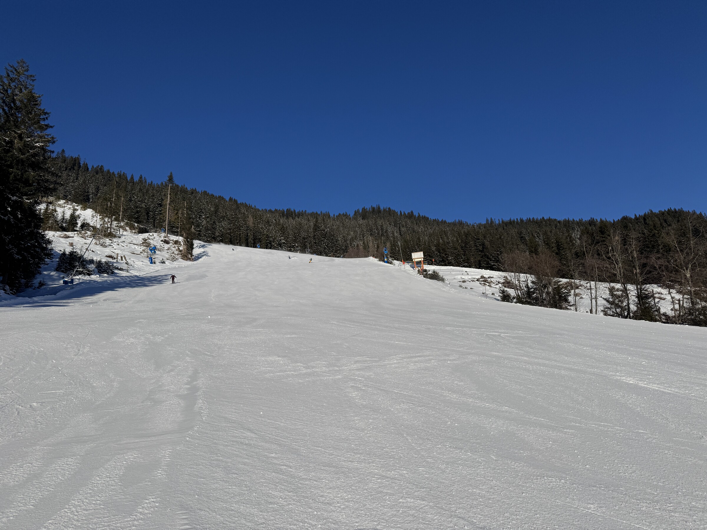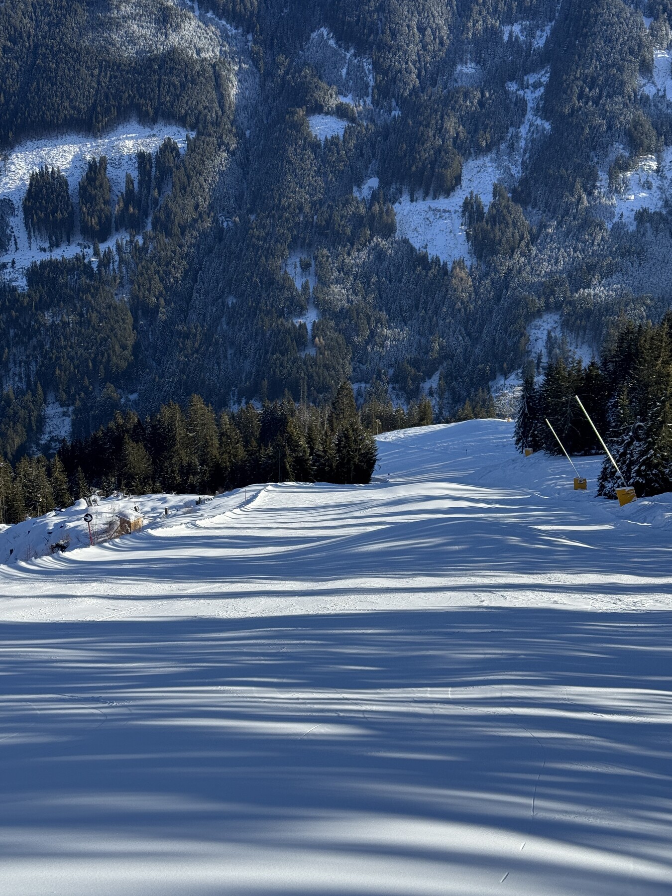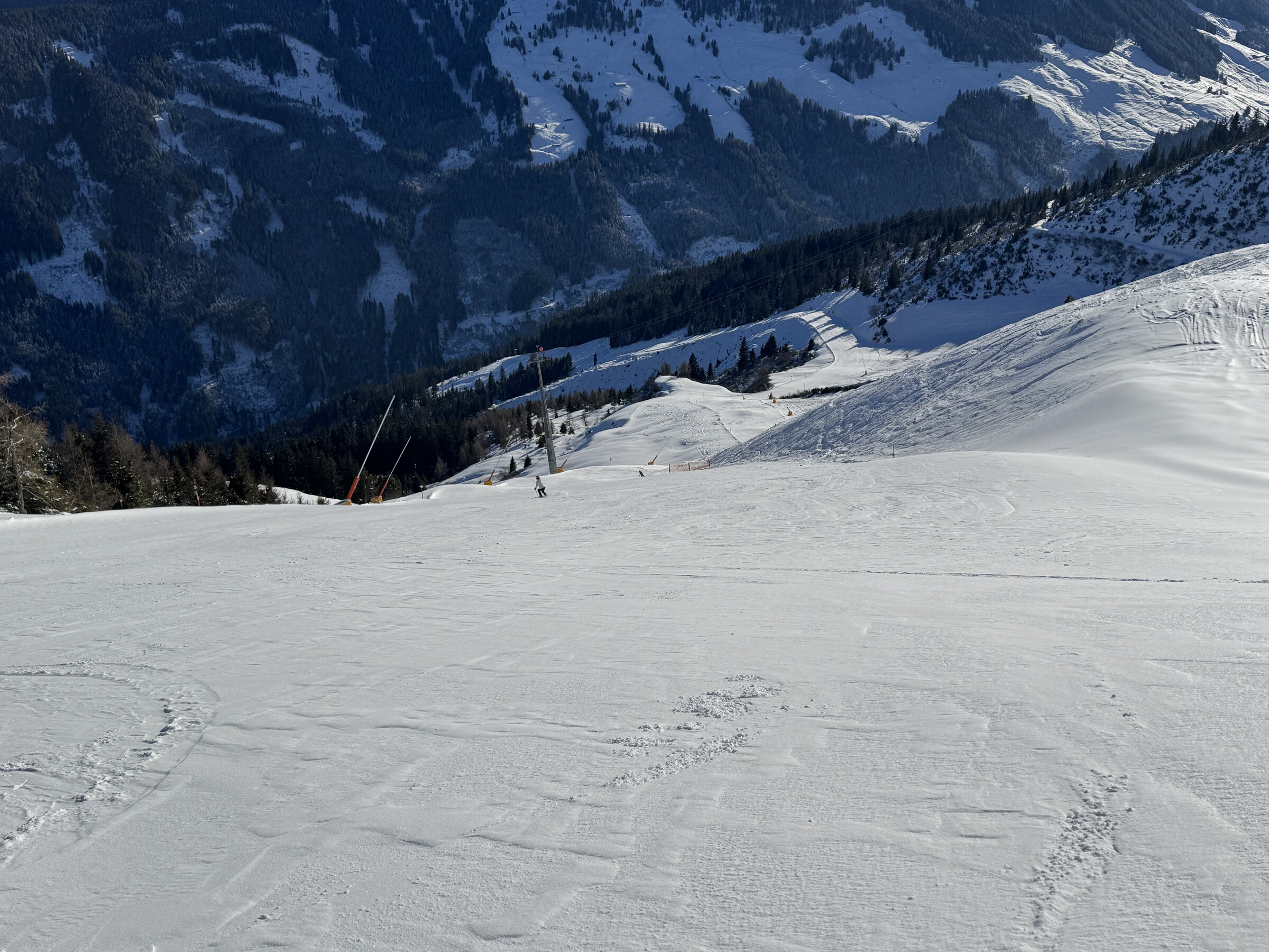 Interessanterweise war die abschließende Talabfahrt gegen 15:45 Uhr heute besser als die anderen drei vorherigen (Vormittag/Mittag) , weil der Schnee nicht mehr stumpf war.