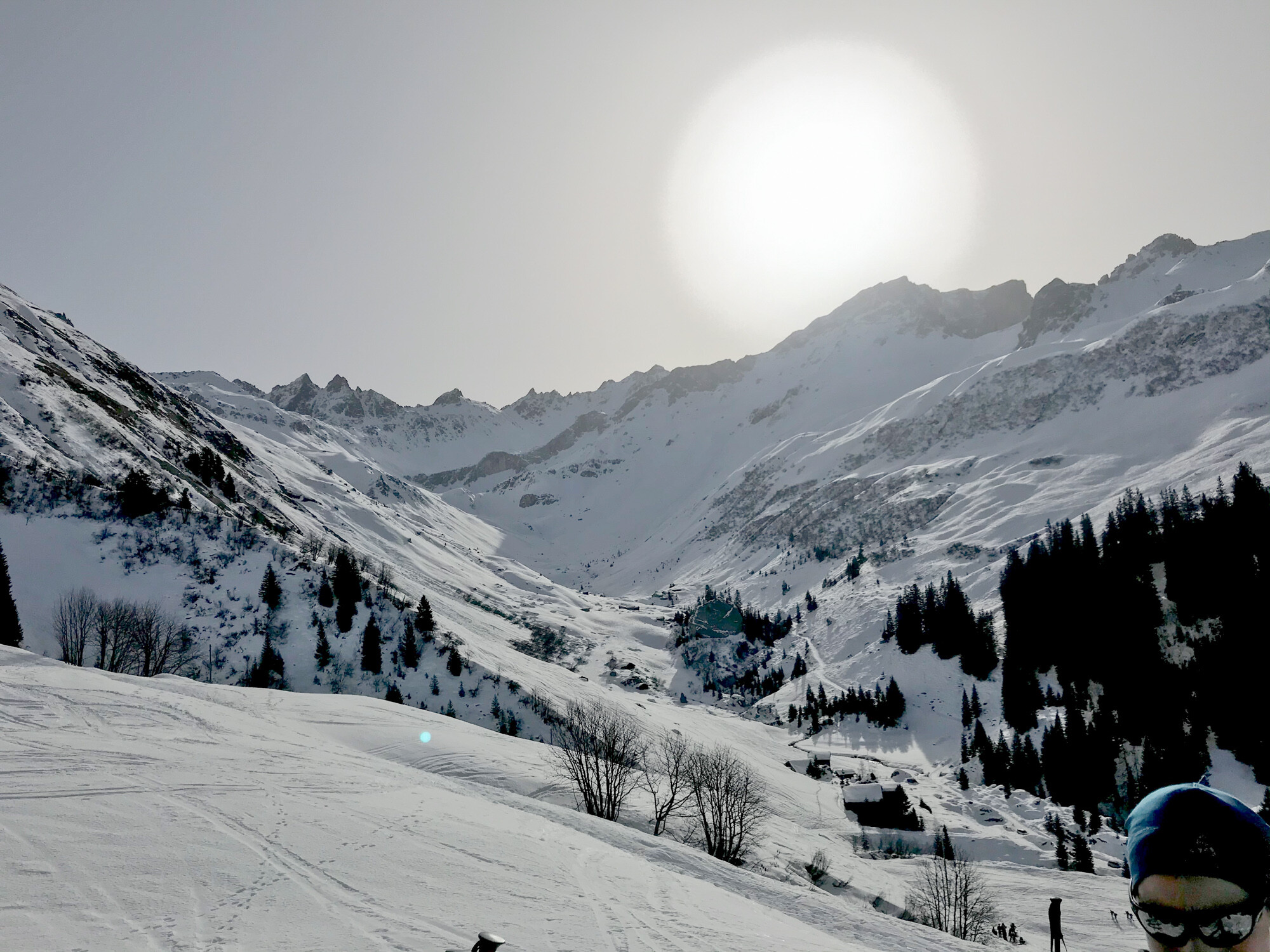 Der morgen des 20.1. endet dann von alleine um 6:30. Natürlich bin ich um 7 der einzige beim Frühstück. So früh hätte es gar nicht sein müssen, entweder starte ich direkt hier im Dorf oder 5min weiter oben von einem der Parkplätze. Ich entscheide mich schließlich als schöne aber überschaubare Tour für die Girenspize. Dafür fährt man 5min weiter das Tal hinauf bis zum Beginn der Wintersperre auf P5. Von hier sind es 900 Höhenmeter bis zum Gipfel. Neben mir fellen noch drei andere an, insgesamt ist es aber leer. Werktag und WEF - da gehen nicht so viele trotz gutem Wetter.