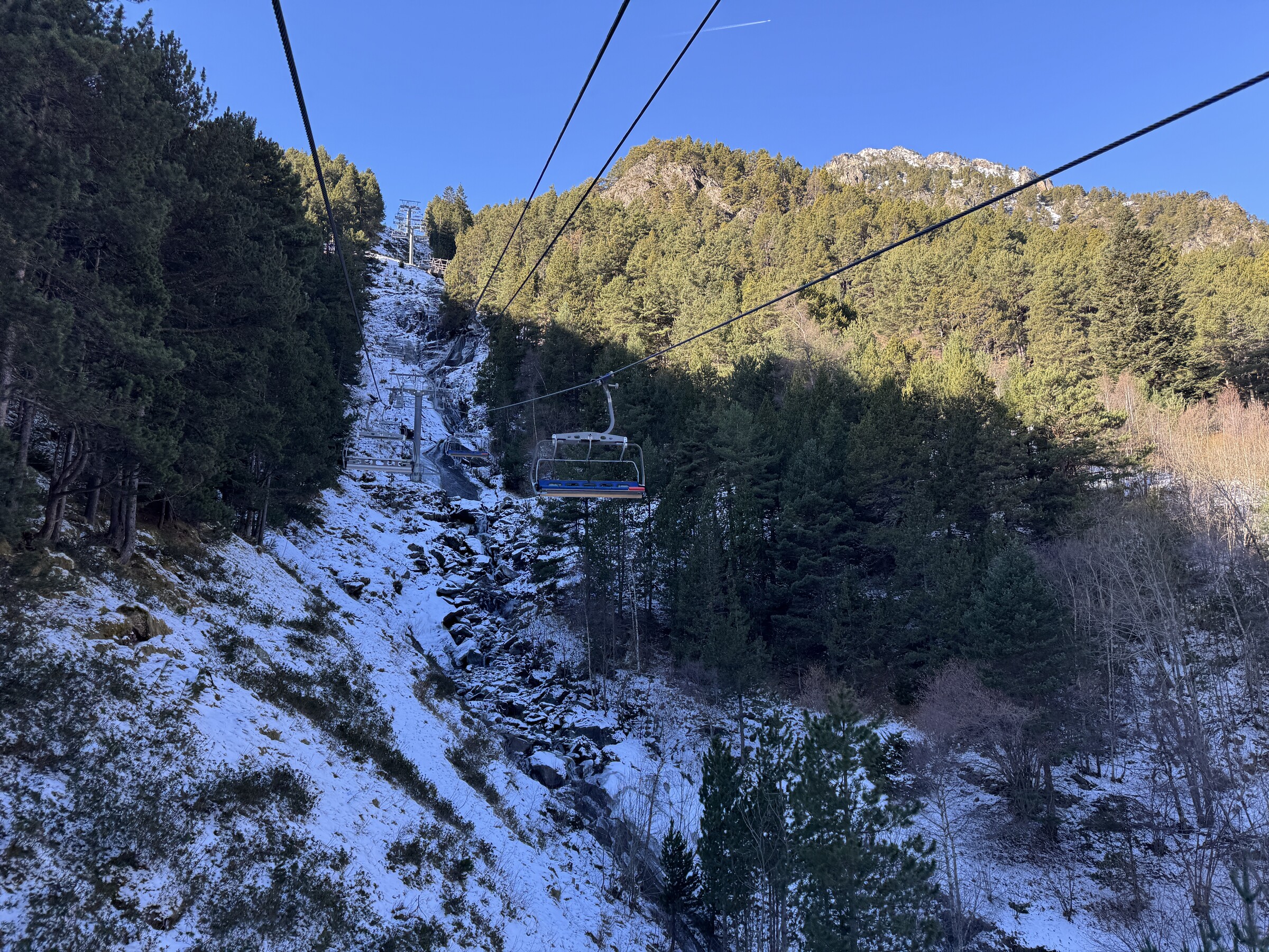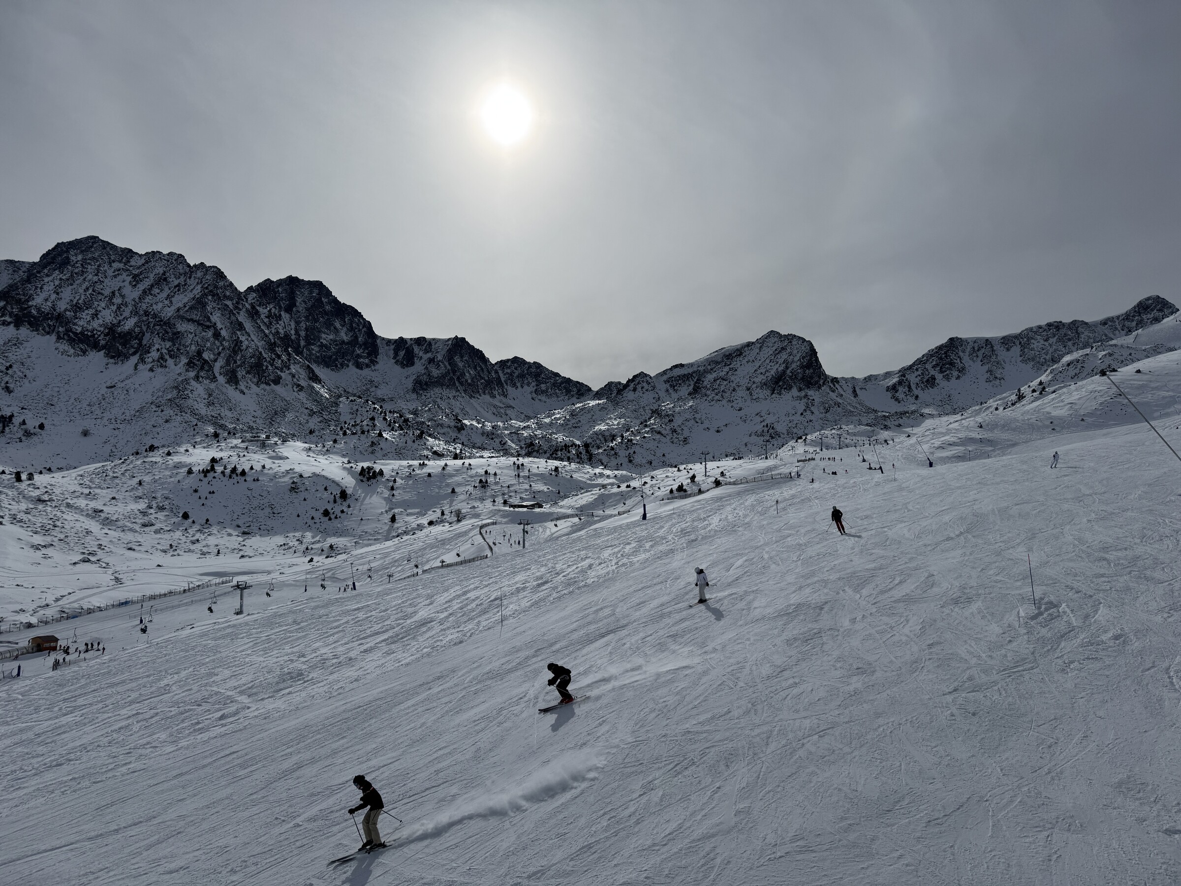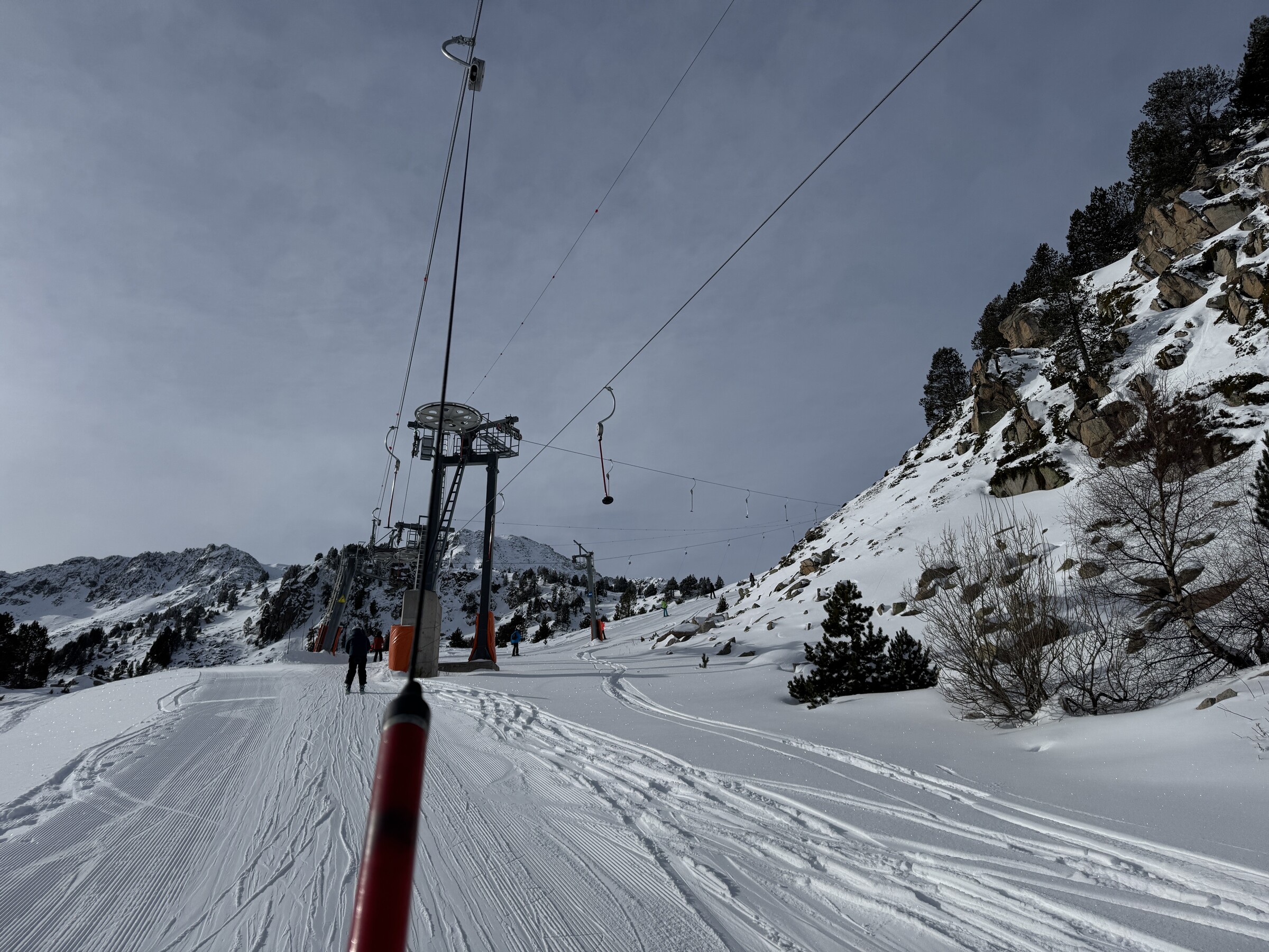 Nachdem es ja 5 Tage perfektes Wetter hatte, war für den Freitag nicht mehr ganz so gutes Wetter angekündigt. Und vor allem sollte es windig werden. Da aber in Grandvalira einige Lifte am Kamm waren, sind wir nochmal nach Pal Arinsal gefahren. Dort gab es mehr Waldabfahrten, und man konnte schlimmstenfalls gut aus Arinsal wieder mit dem Bus zurückfahren, falls die PB nicht mehr fährt. Das wäre zwar grundsätzlich auch aus Soldeu möglich gewesen, aber wenn dann dort viel Betrieb ist, vielleicht nicht so eine gute Lösung.