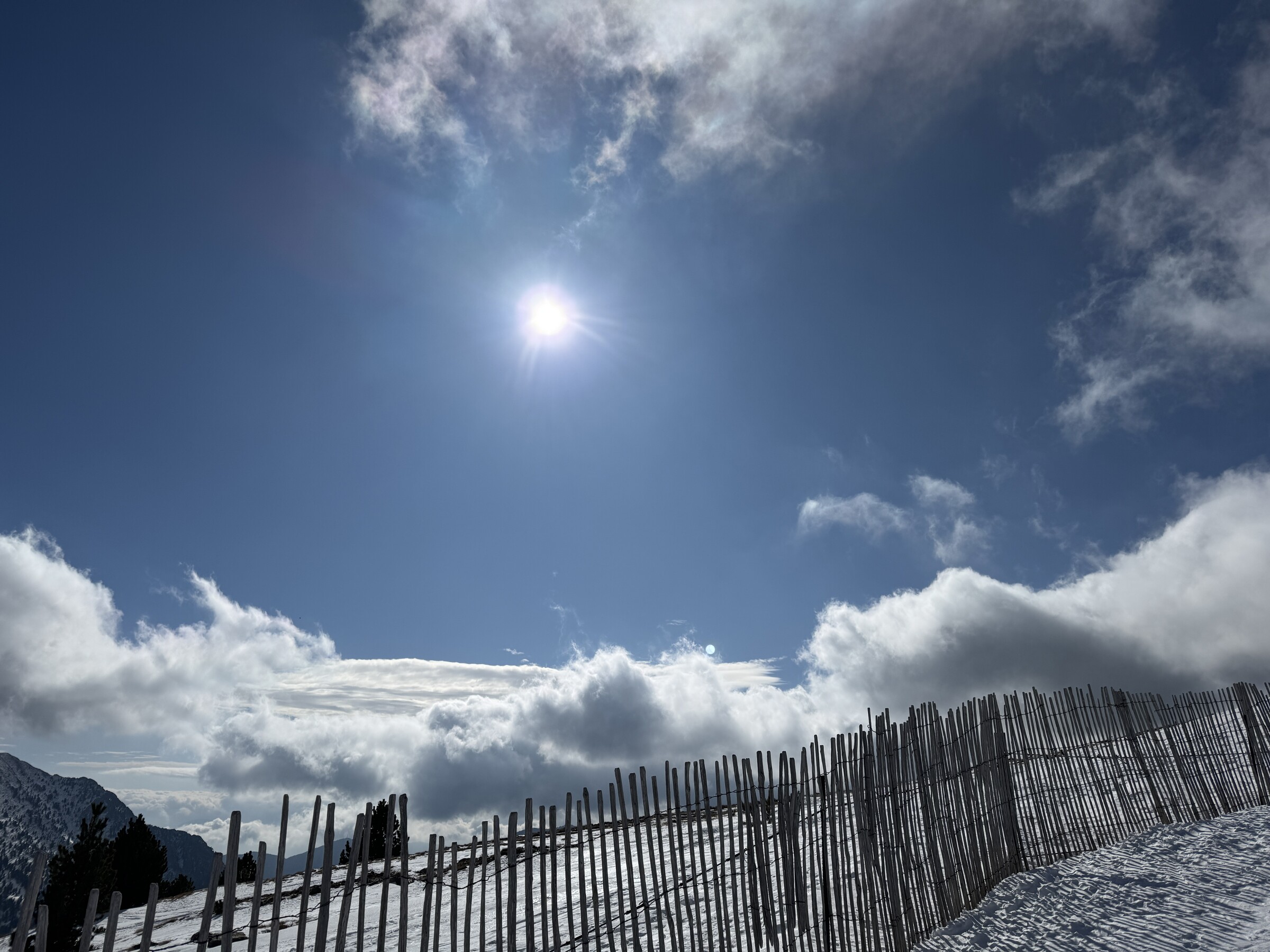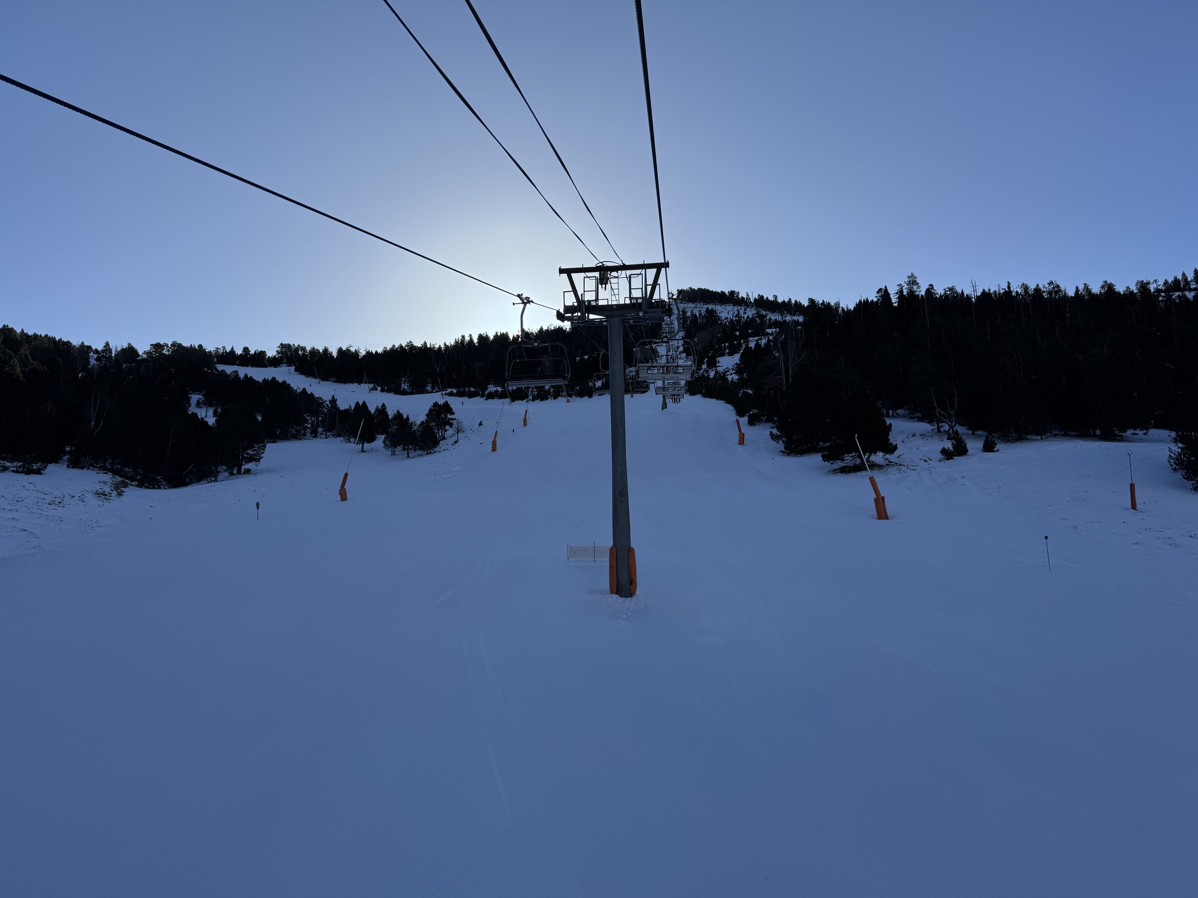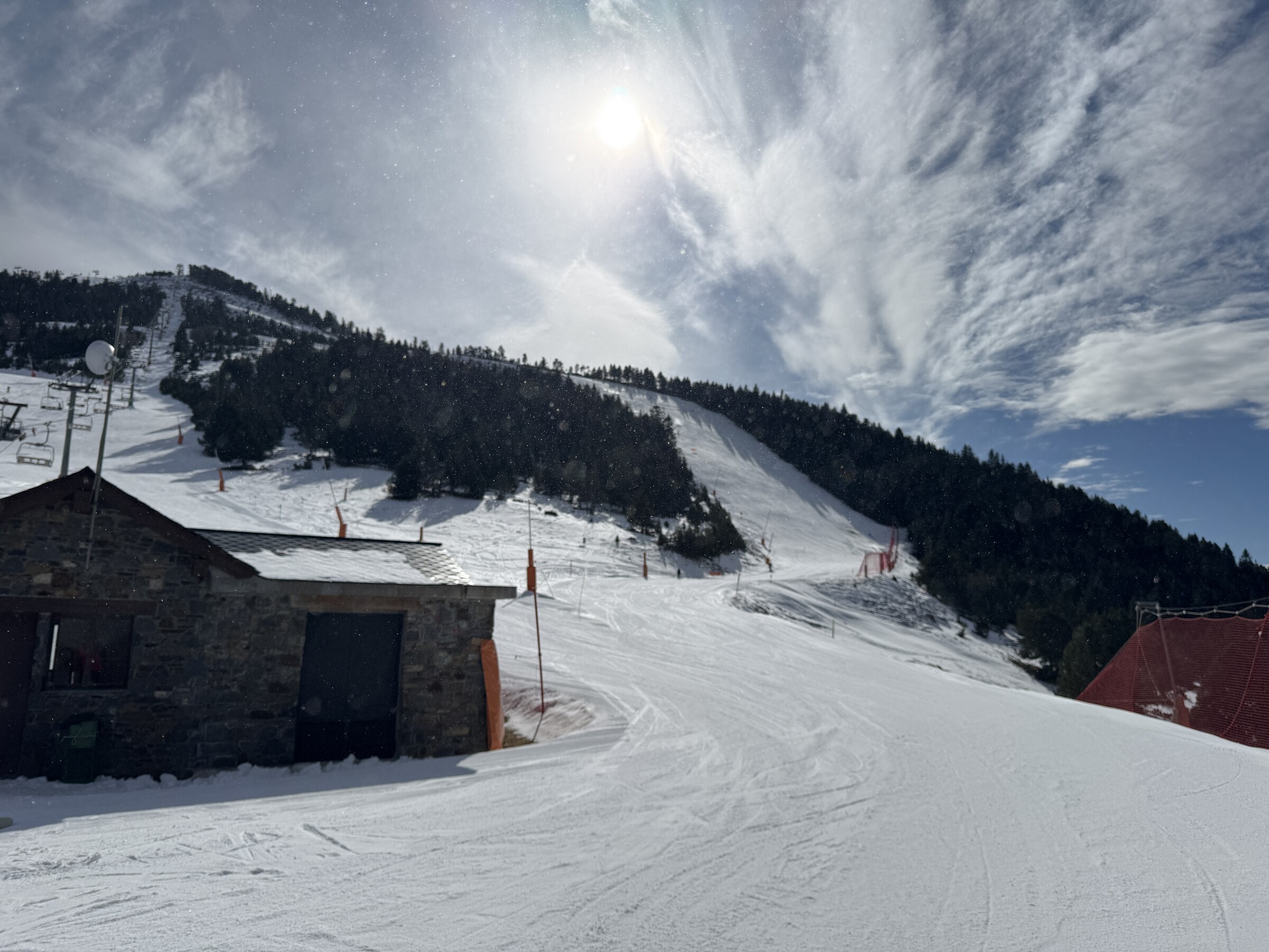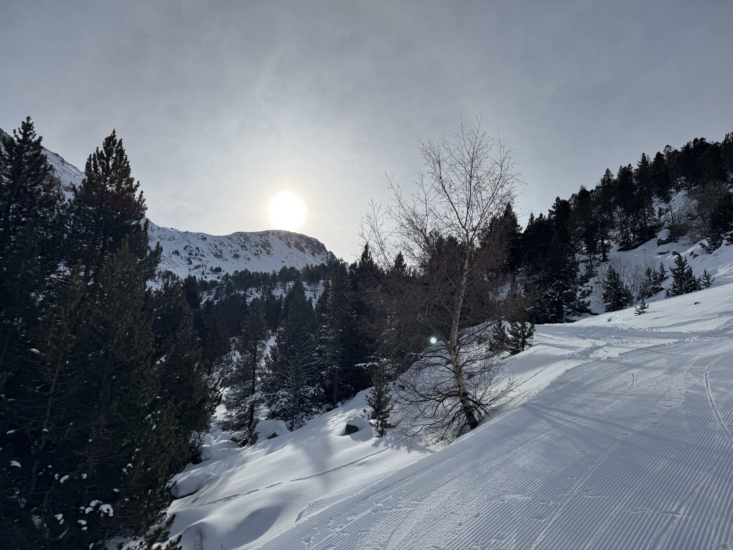 Nachdem es ja 5 Tage perfektes Wetter hatte, war für den Freitag nicht mehr ganz so gutes Wetter angekündigt. Und vor allem sollte es windig werden. Da aber in Grandvalira einige Lifte am Kamm waren, sind wir nochmal nach Pal Arinsal gefahren. Dort gab es mehr Waldabfahrten, und man konnte schlimmstenfalls gut aus Arinsal wieder mit dem Bus zurückfahren, falls die PB nicht mehr fährt. Das wäre zwar grundsätzlich auch aus Soldeu möglich gewesen, aber wenn dann dort viel Betrieb ist, vielleicht nicht so eine gute Lösung.