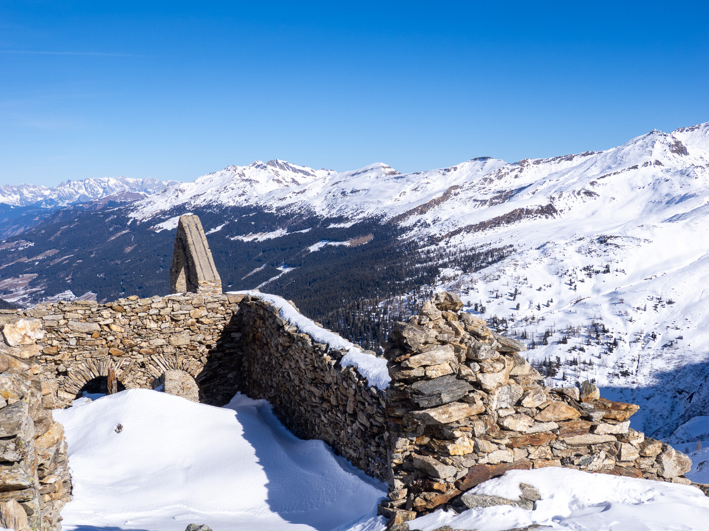 So wie in Gastein am Nassfeld war auch die Gegend oberhalb von Kolm Saigurn früher ein Zentrum des inneralpinen Goldabbaus. Oben am Horizont kann man schon das Radhaus erkennen, in dem im 19. Jahrhundert der Antrieb für einen der ersten Schrägaufzüge der Alpen installiert war. Hier kann man die Trasse des Schrägaufzugs erkennen. Wieder das Radhaus, im Hintergrund das Rauriser Tal Glücklicherweise ist der Wind nicht kalt, sonst wäre es hier wohl nicht auszuhalten.... Wie eingangs erwähnt, keine sanften Schneelandschaften heute.... Zwischen der Naturfreundehütte Neubau im Vordergrund und dem Ammererhof im Hintergrund liegen über 550 Höhenmeter! Es ist durchaus anspruchsvoll, zwischen den Felsen die Passagen mit ausreichend Schnee zu finden! Hier die Ruine eines früheren Knappenhauses: Und der Blick zum Sonnblick von der anderen Seite, die einst mächtigen Gletscher sind in den letzten Jahrzehnten massiv geschrumpft. Allerdings lässt nun der Wind plötzlich komplett nach und in der Sonne wird es für einige Zeit ziemlich heiß. Als wir allerdings nach ca. 1250 Höhenmetern Aufstieg die Fraganter Scharte (2754m) erreichten, packt uns der Sturm wieder mit voller Kraft, sodass Helmut und Sabine eher ungeduldig werden, als ich noch meine Fotodokumentation durchführe. Den Aufstieg zur Herzog Ernst Spitze lassen wir aus. Sonnblick mit Vogelmaier-Ochsenkarkees Dann lichte ich die Anlagen am Mölltaler Gletscher aus eher unüblicher Perspektive ab. Noch einige Bilder von der abgewehten Hochfläche und auch nochmals vom prächtigen Sonnblick-Panorama. Wir begeben uns nun aber zur Einfahrt in die Wintergasse.