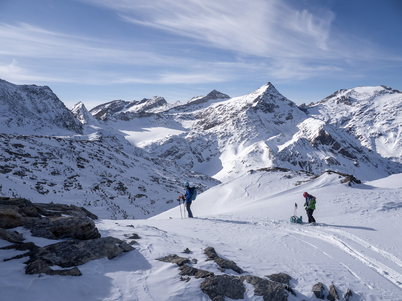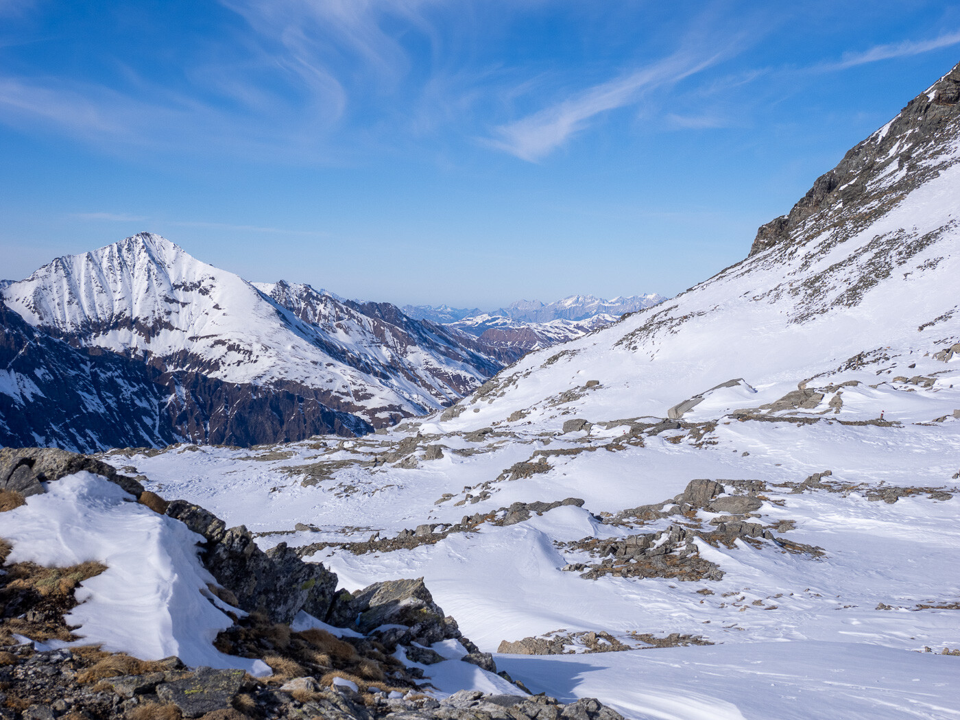 Oft findet man beim Tourengehen weiche, wie in Watte gepackte Berglandschaften, doch der heurige niederschlagsarme Winter bietet harte Kontraste, viele Felsen und vom Sturm modellierten Schnee. So war es auch heuer bei unserer zweiten Tour in Kolm Saigurn, der uns zur Fraganter Scharte am Alpenhauptkamm und zur Wintergasse führen sollte. Wie ich ja andernorts vor vielen Jahren ausgeführt habe, sollte dieser Abschnitt der Hohen Tauern ja in den 70-er Jahren des vergangenen Jahrhunderts ja Teil eines riesigen Schigebiets werden, dass in seiner Endausbaustufe durchgängiges Schifahren zwischen Bad Hofgastein und Heiligenblut ermöglicht hätte.