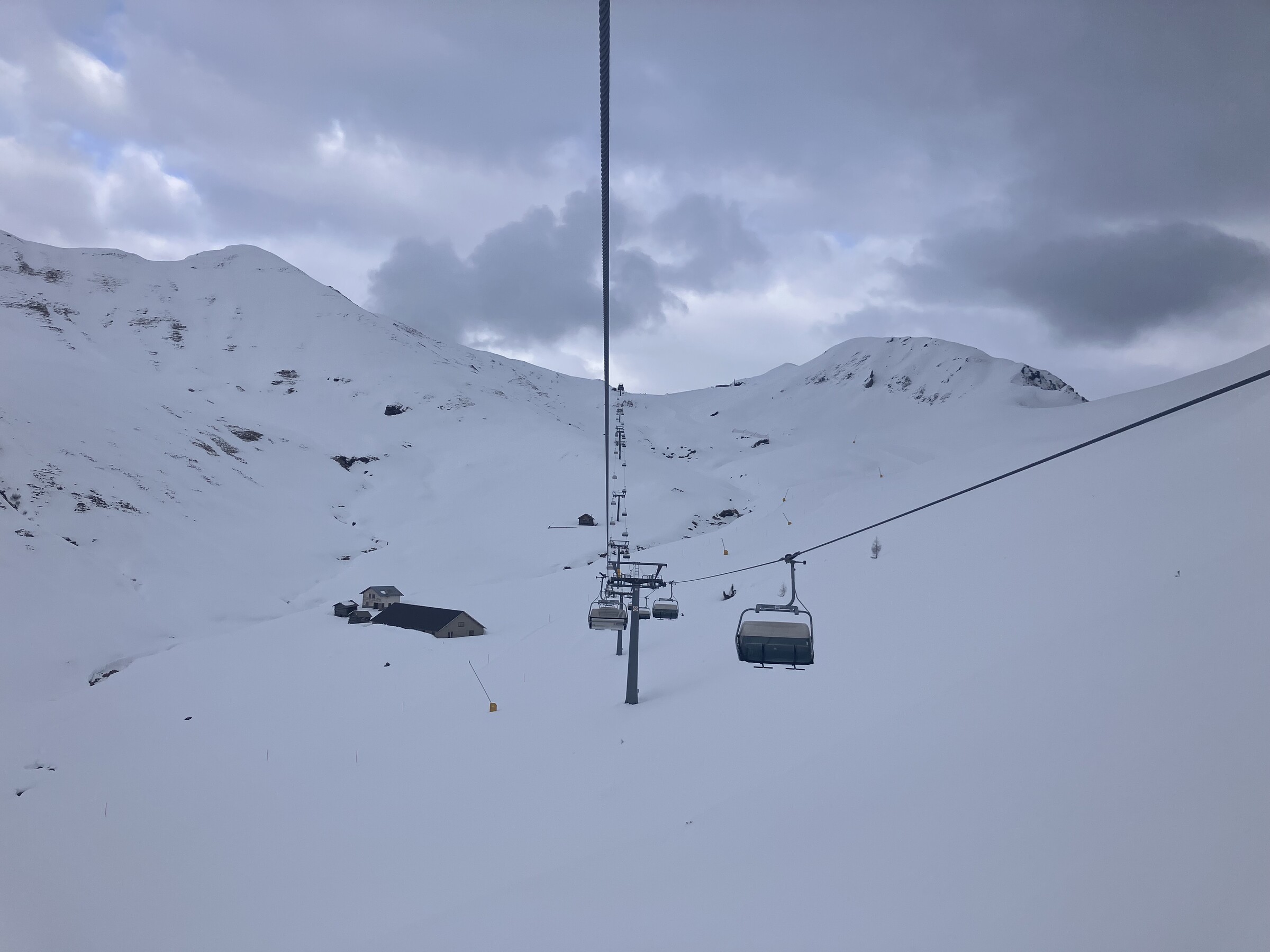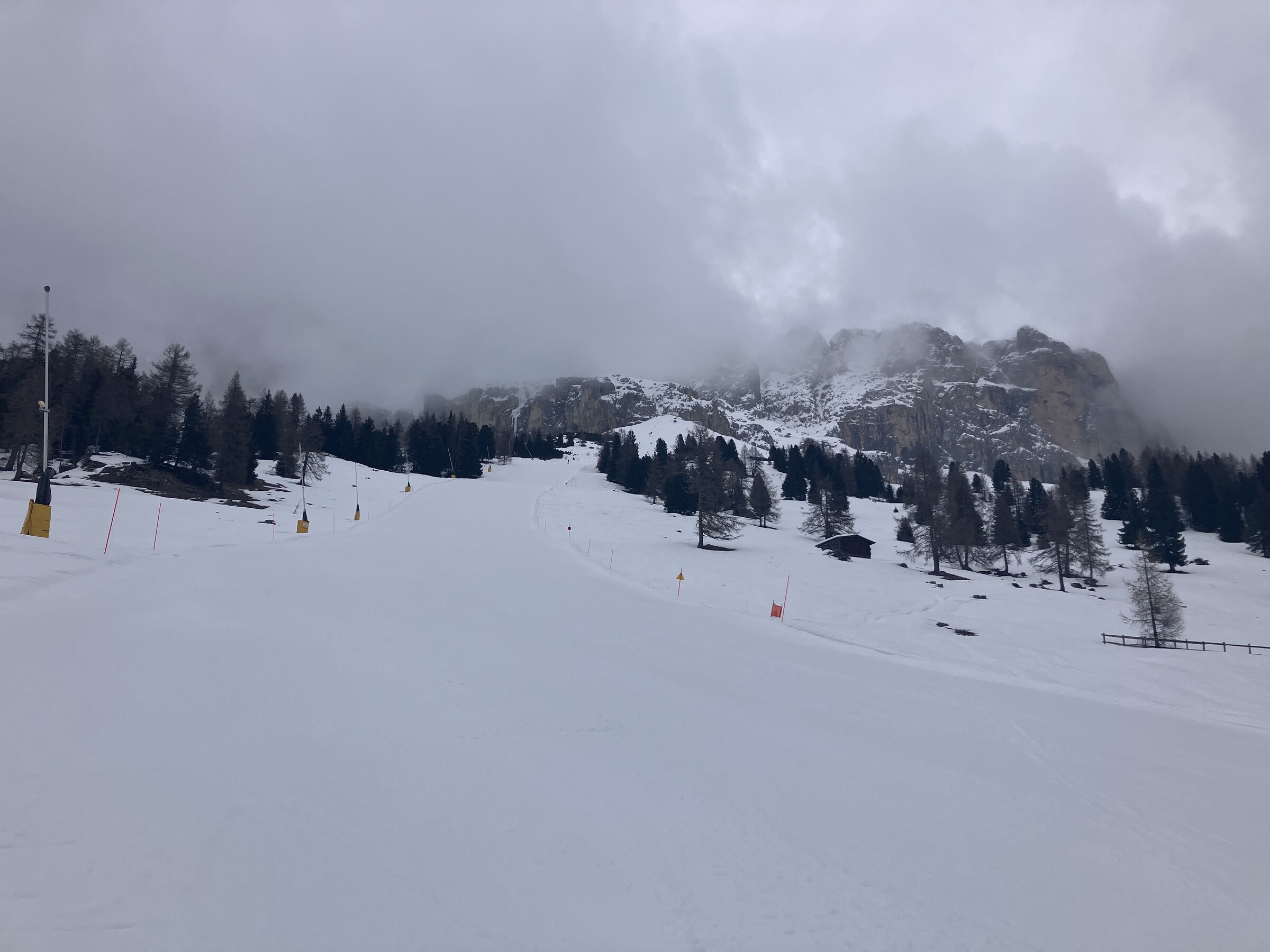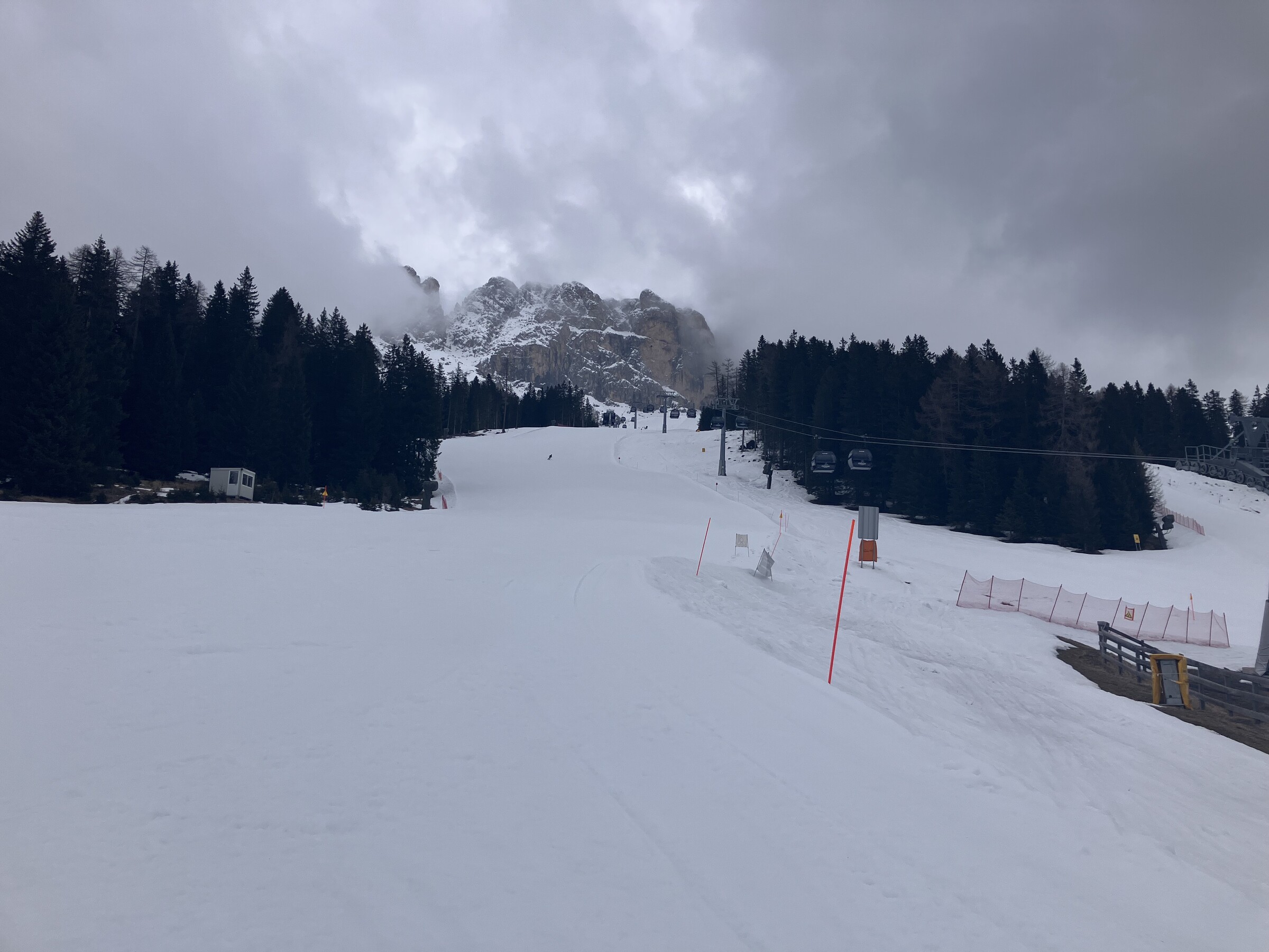 Ciampac menschenleer. Längst sind alle Lifte (bis auf die EUB) abgestellt. Bis zur Talstation sollte ich niemand mehr begegnen.