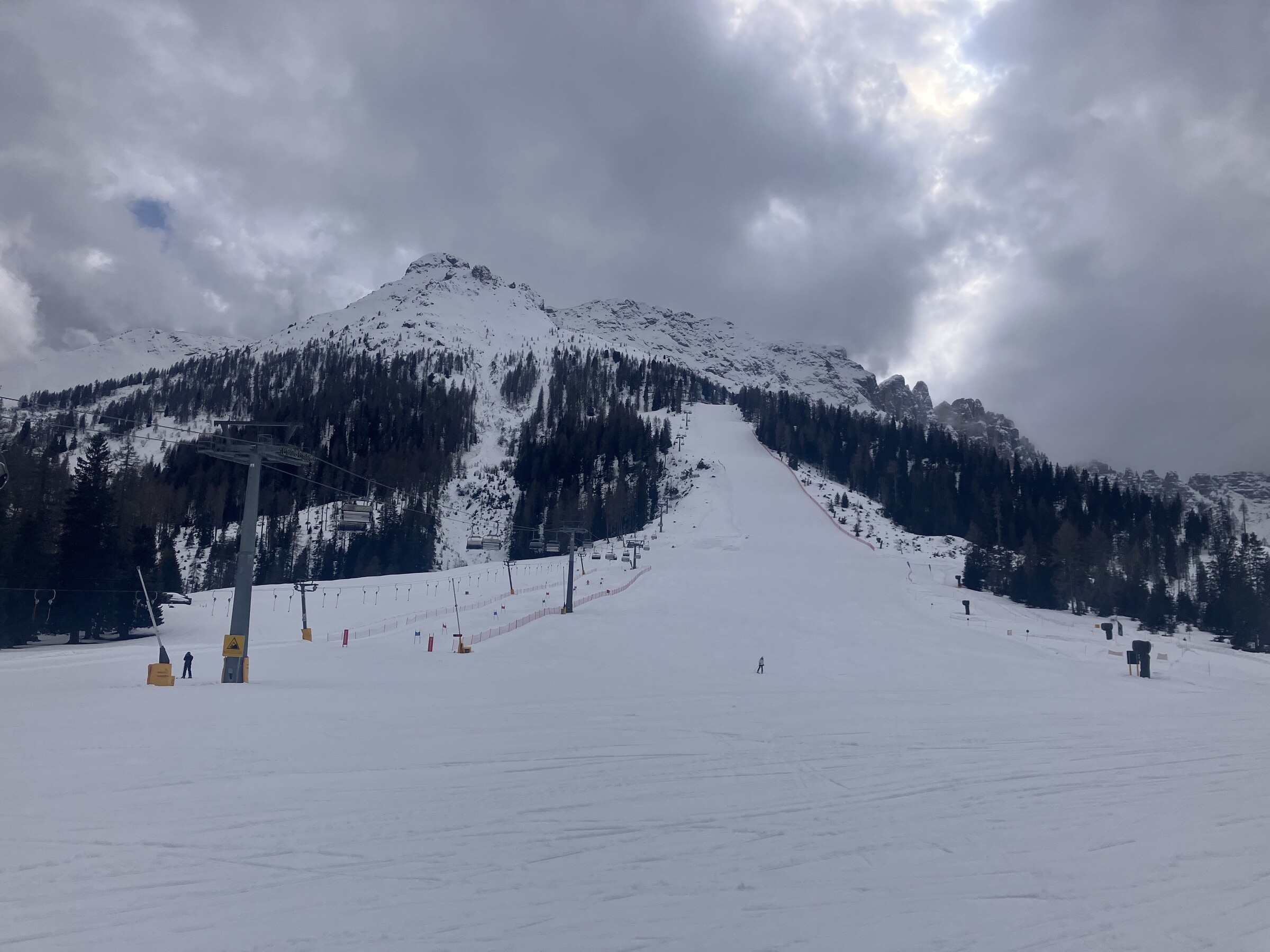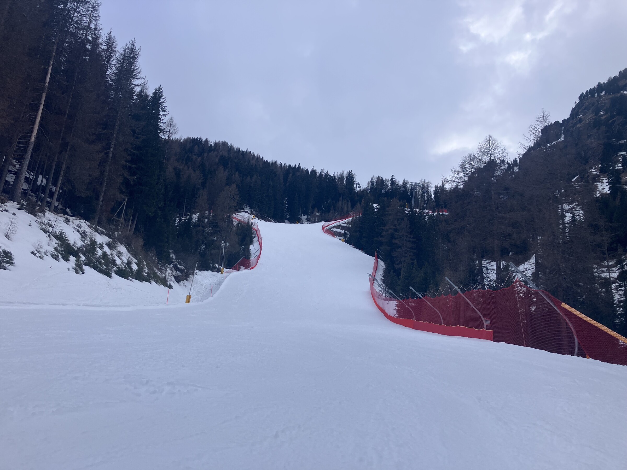Oben am Belvedere wieder Geisterskigebiet. Nachdem ich angebe "Pista del Bosco" darf ich losfahren. Viel weiter unten, am Abzweig Lupo Bianco, treffe ich die ersten Skifahrer.