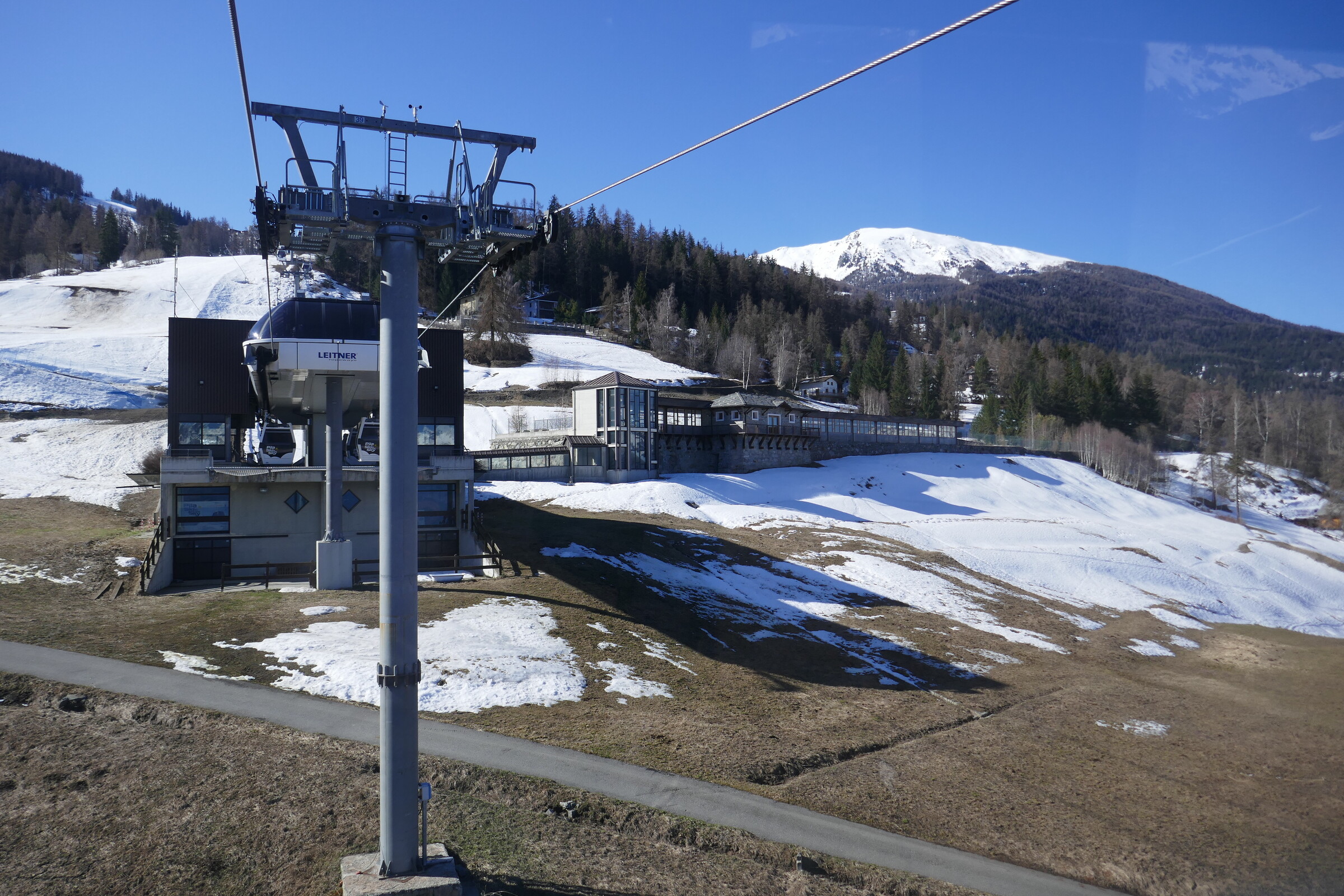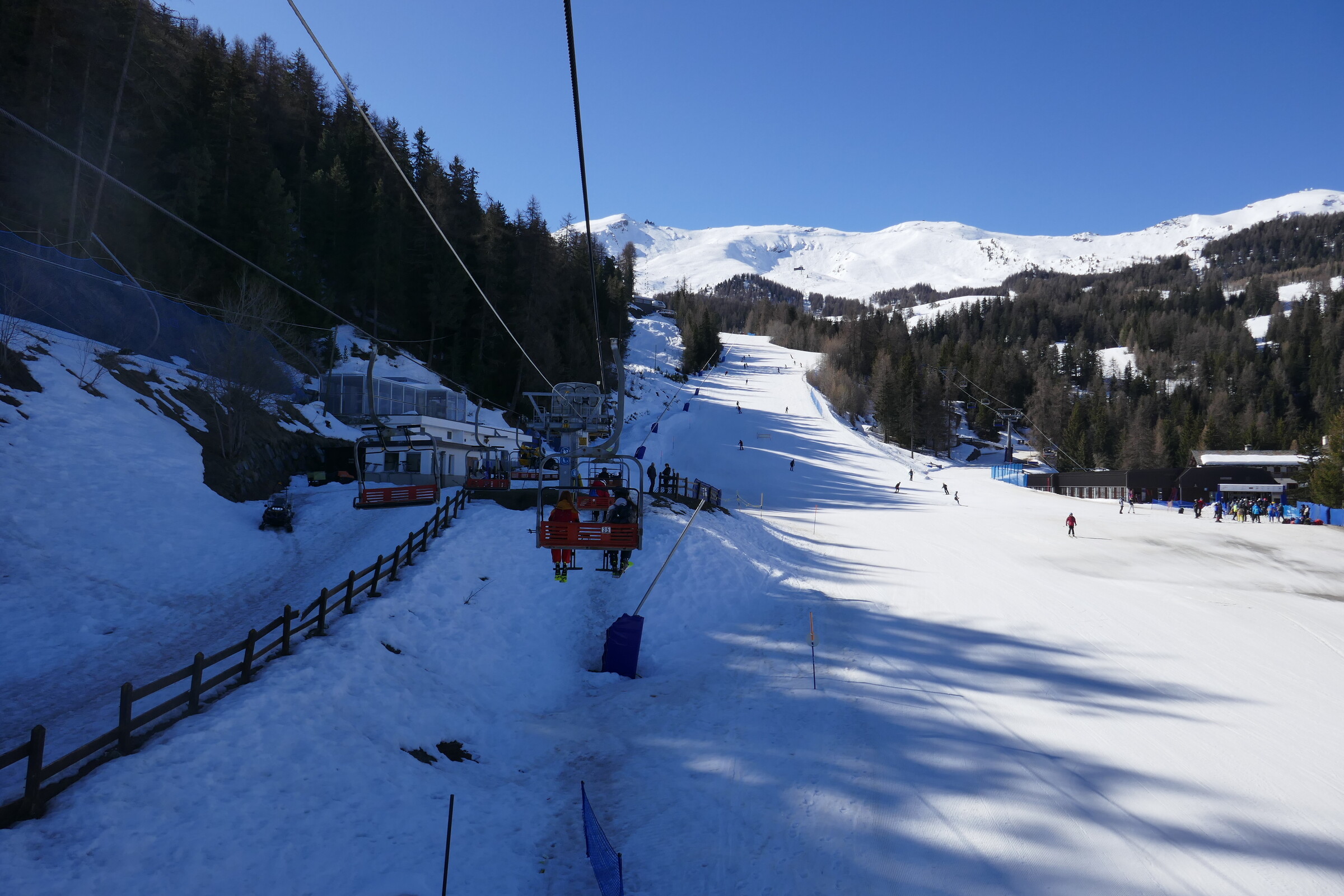 Zweite Mittelstation mit einziger bereits gesperrter Piste im Skigebiet. Rechts der Bahnhof für die bereits fertiggestellte aber nie in Betrieb gegangene Tunnelbahn von/nach Cogne.