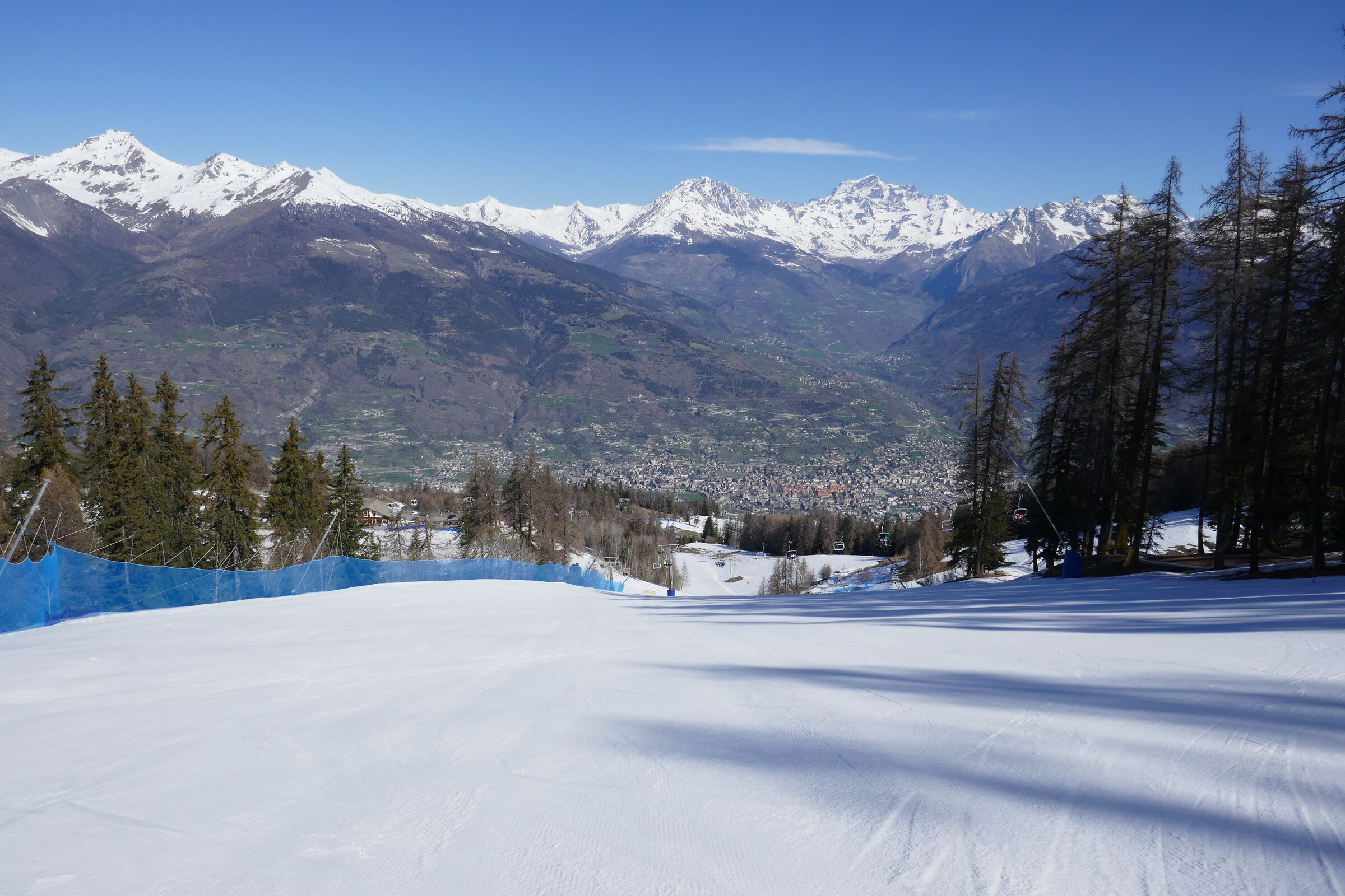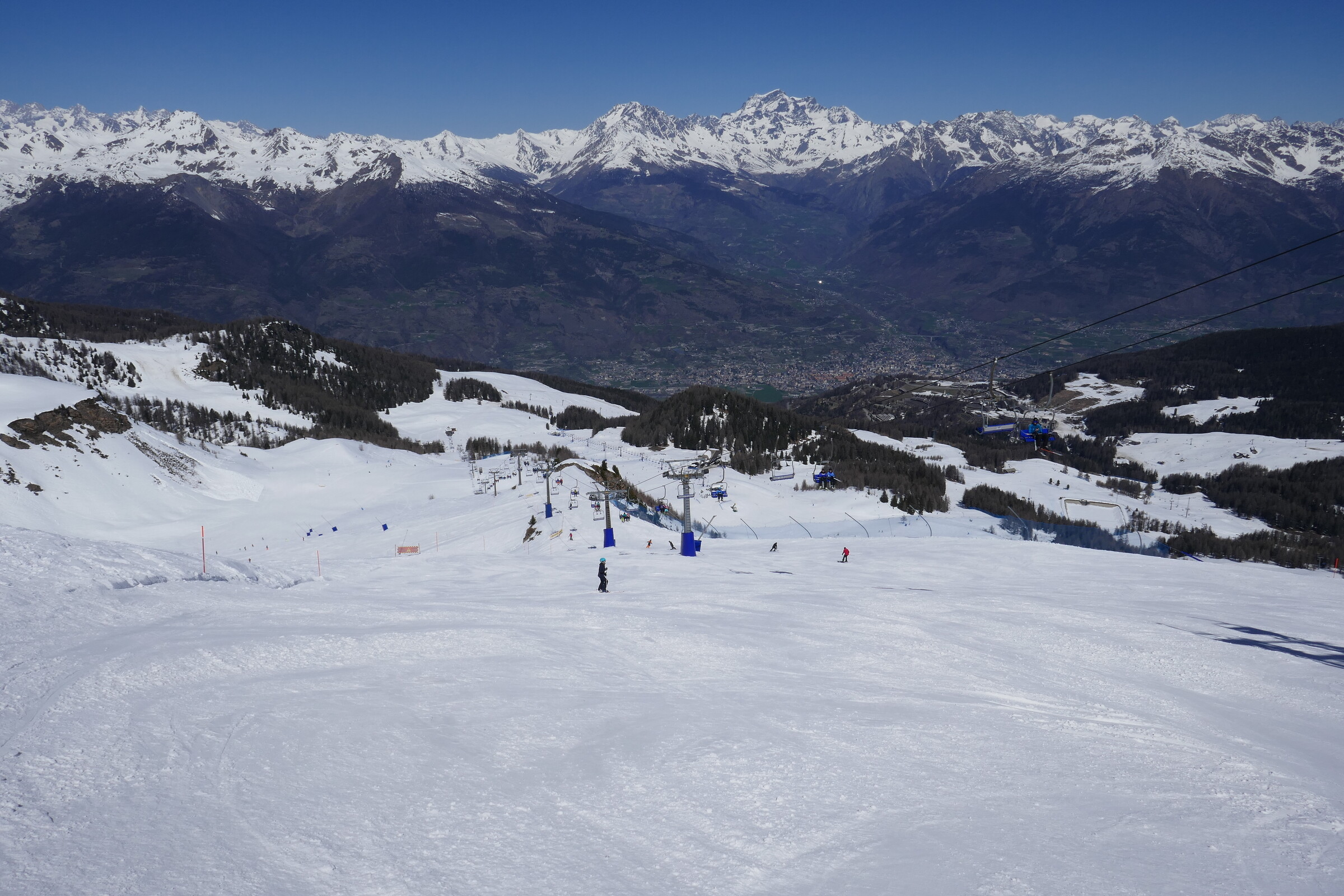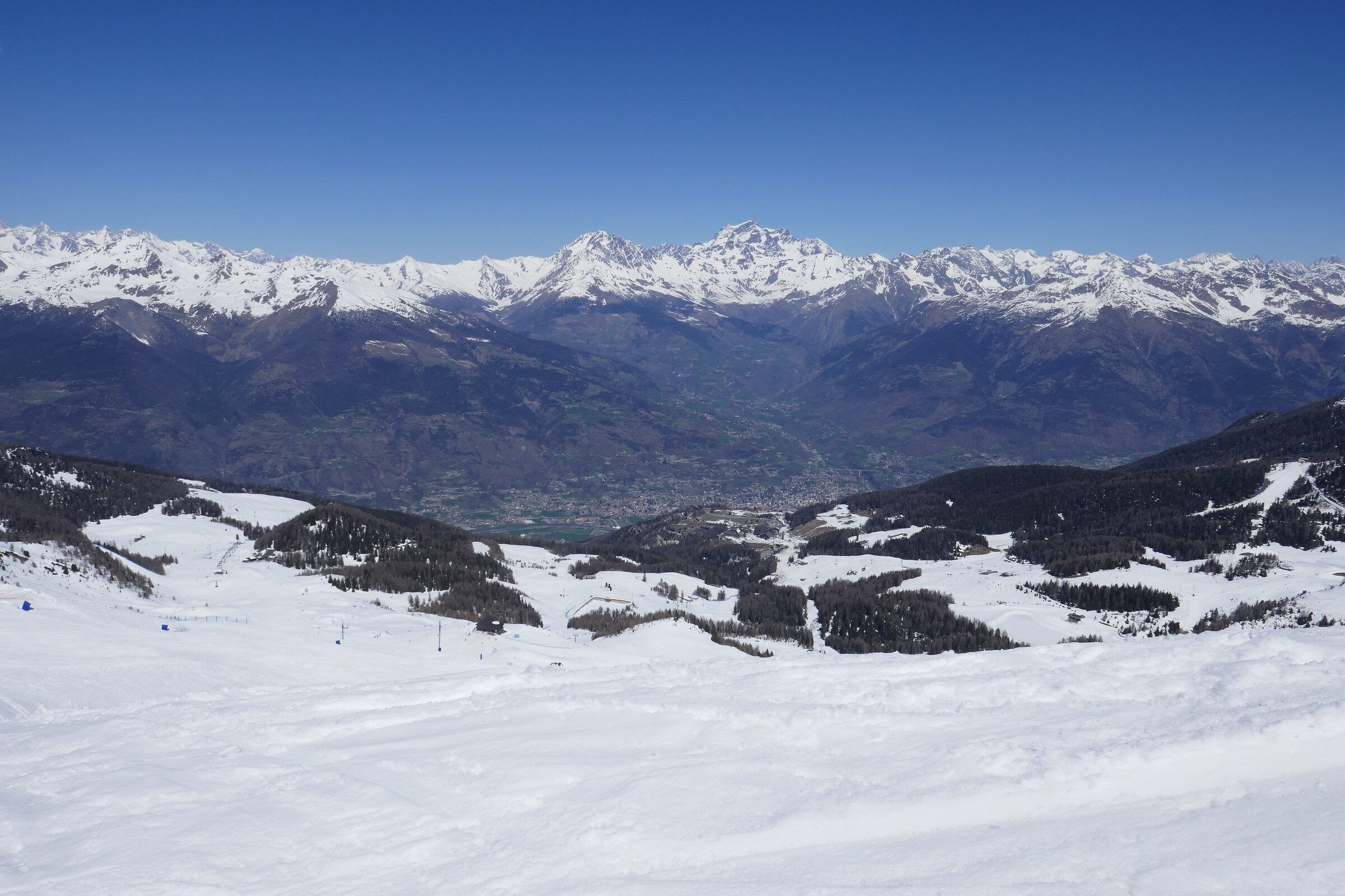 Du Bois weiter unten. Der tolle Winter - Frühling – Winter Kontrast ist allgegenwärtig im Skigebiet wenn man Richtung Aosta schaut.