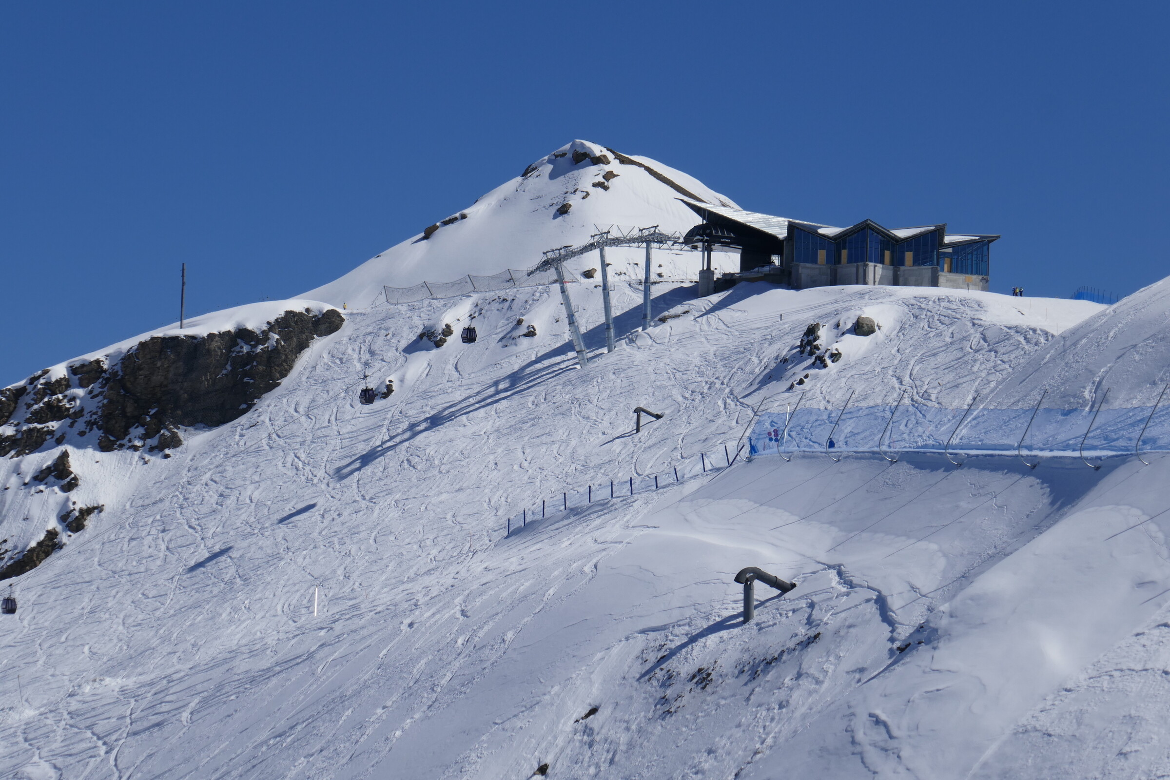 Am Ende des Tages die gewohnte Sulzschlacht im Bereich Gorraz. Rechts bei der Bergstation der 3SB kommt die Mittelstation der weiteren EUB hin, die im Sommer gebaut wird. Wenn die Bahn fertig ist kann man in ca. 30 Minuten vom Tal von ca. 650 bis auf 2720m hinauffahren. Dafür nutzt man dann 6 Sektionen EUB!