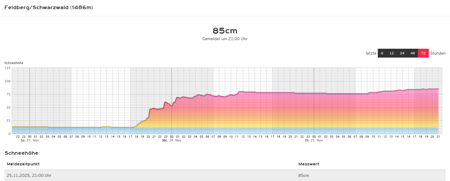 Bei der aktuellen Schneehöhe von 85 cm am Feldberg soll es sich um die höchste Schneehöhe in einem November seit 50 Jahren handeln. Wenn das mal keine Grundlage ist und einen guten Saisonstart verspricht.