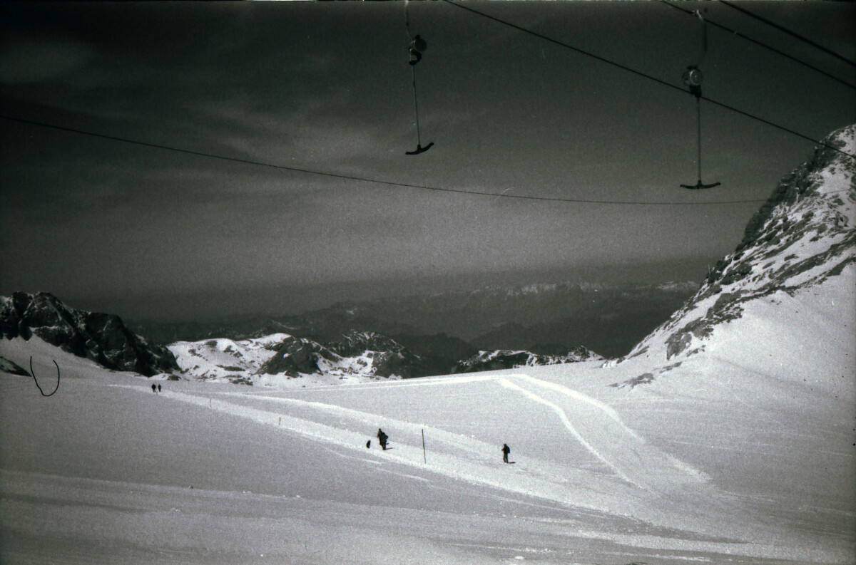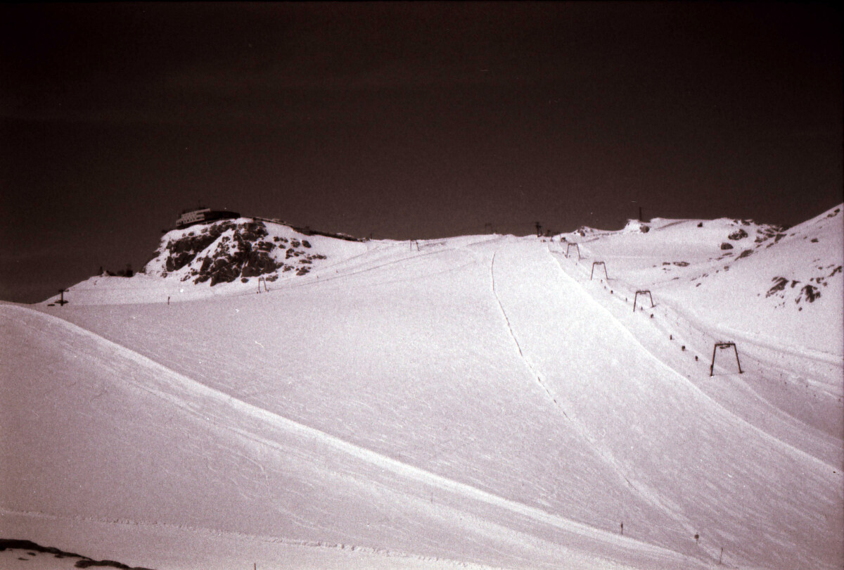 Hier die spektakuläre Trasse der stützenlosen Südwandbahn. 1991 herrschte hier Nebel, sodass man nicht so einen guten Blick drauf hatte. Seitdem war ich die Südwandbahn nicht mehr gefahren. Einmal besuchte ich 2018 das kleine Schleppergebiet an der Talstation und im Sommer 2012 stiefelte ich hier oben mal herum. Aber hinauf auf den Gletscher bin ich erst 2022 wieder gekommen.
