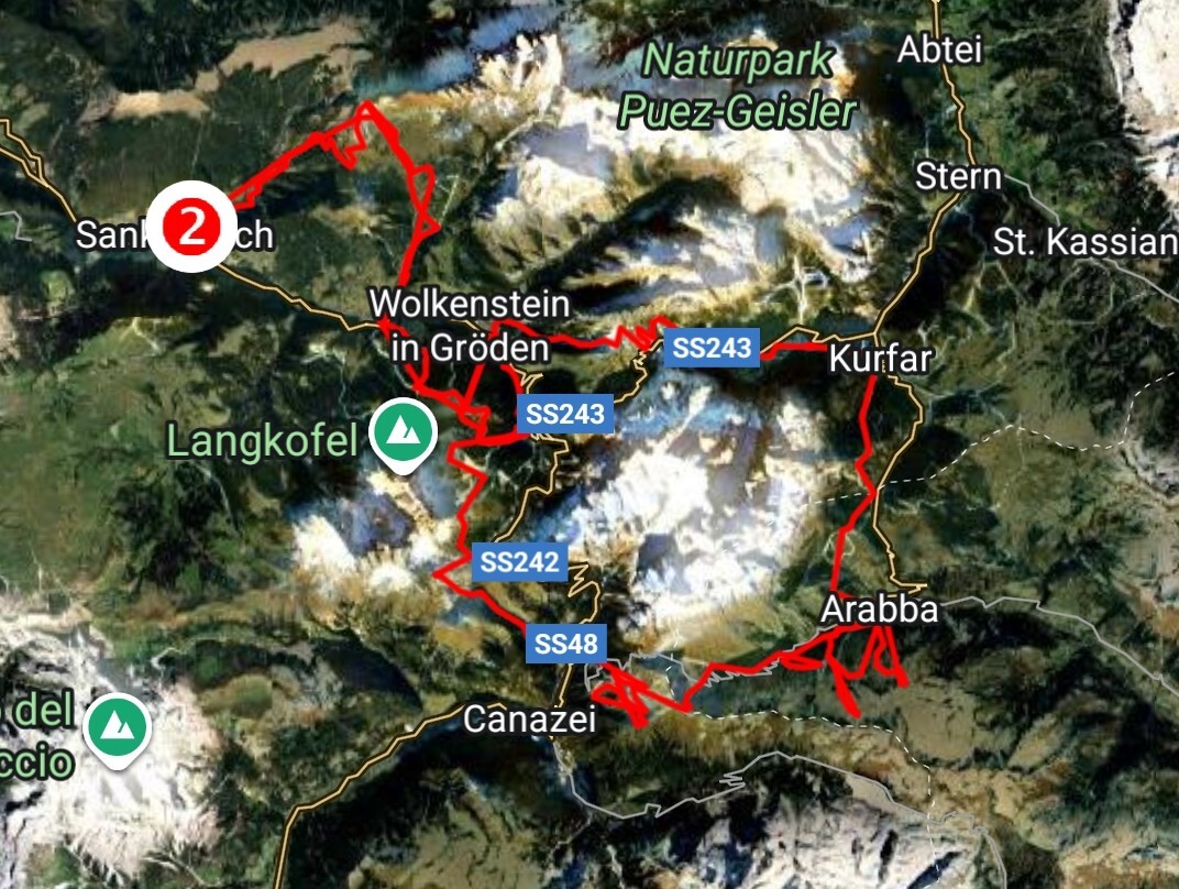 Los ging es in St. Ulrich via Seceda, St. Christina, Wolkenstein zum Sella Joch. Danach dann weiter Richtung Belvedere, Arabba, Alta Badia und wieder zurück via Dantercepies, Campinoi, Col Raiser und Seceda zurück zum Ausgangspunkt in St. Christina.