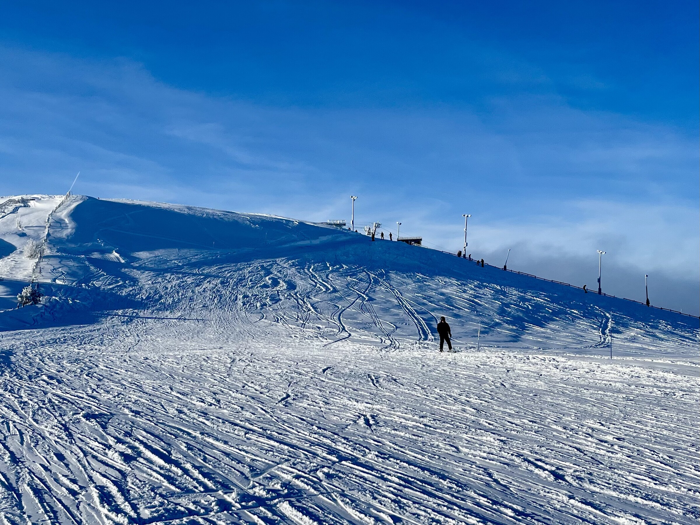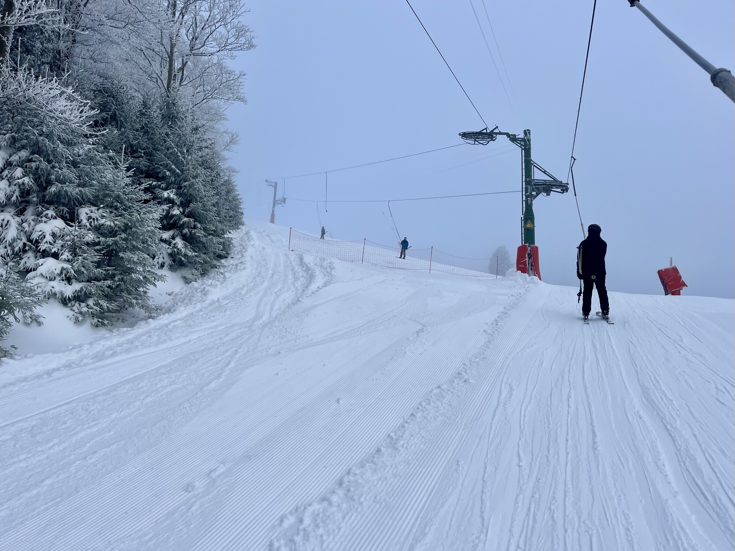 Einmalig? Ja, das Wort ist gerechtfertigt. Sowohl das Liftpersonal („so viel Schnee gab es hier in den letzten fünf Jahren nie“) als auch die rasche Milderung ab Montagmorgen mit (Schnee-) Regen, leichten Plusgraden und früh nachmittags bereits komplett gebrochener Piste zeigen, wie rar solche Momente im Mittelgebirge um 1000 m üNN geworden sind. Und künftig wohl noch rarer werden. 🙏