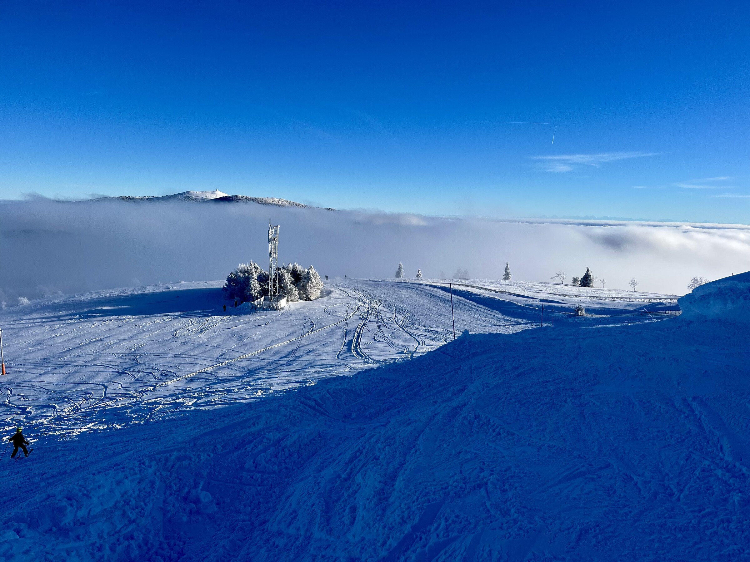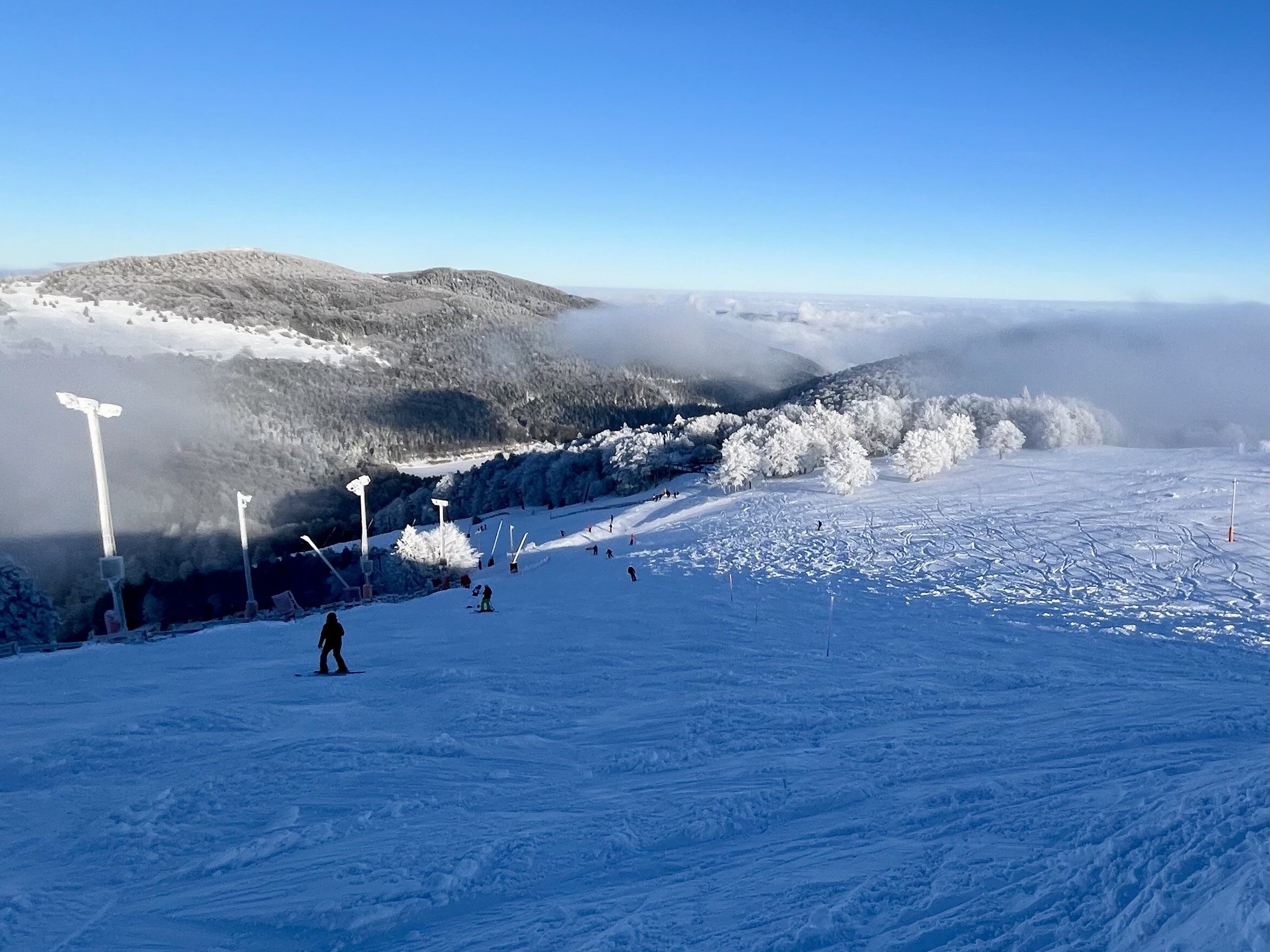 Der Lift ganz rechts, also STEINLEBACH war geschlossen, da hat es sicher oben am Kamm nicht gereicht dank ungünstiger Windexposition während der rund 30-stündigen Schneephase vorher und fehlender Beschneiungsanlage, die vorher für Grundlage hätte sorgen können. Die lange Blaue dort runter (13: Les Chaumes) - speziell in Kombi mit der schwarzen Kurzanbindung (12: La Combe) - ist mM dabei die schönste Ecke des gesamten Gebietes, wenn offen.
