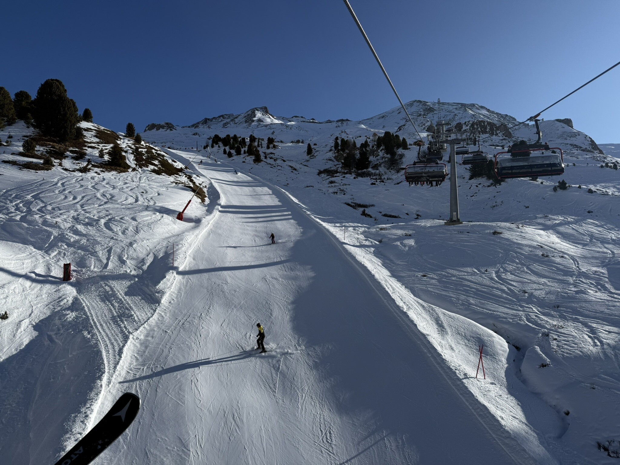 Auch an Tag 4 waren wir wieder früh unterwegs und saßen direkt in der ersten Gondel der Silvrettabahn. Für diesen Tag hatten wir uns bewusst vorgenommen, den Bereich rund um die Idalp endlich einmal intensiver zu erkunden. Bisher diente er für uns meist nur als Durchgangsbereich, sodass einige Lifte und Pisten noch komplett offen waren. Das änderte sich nun: Wir nahmen uns Zeit und fuhren konsequent sämtliche Anlagen und Abfahrten in diesem Bereich ab. Besonders gut gefallen haben uns dabei:
