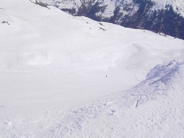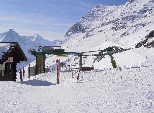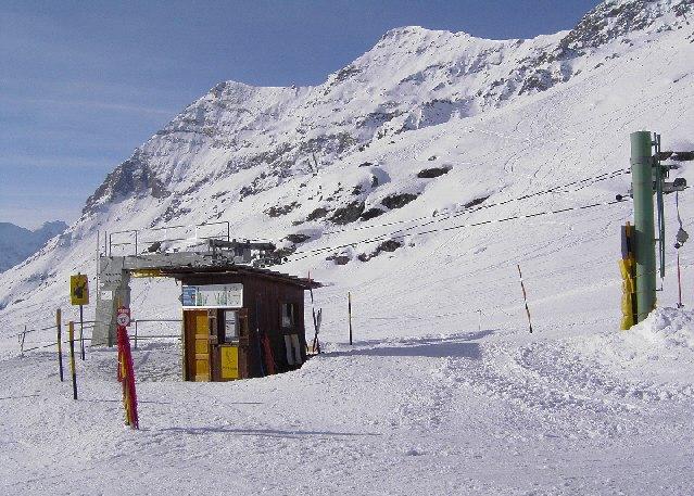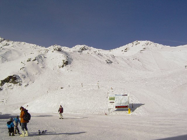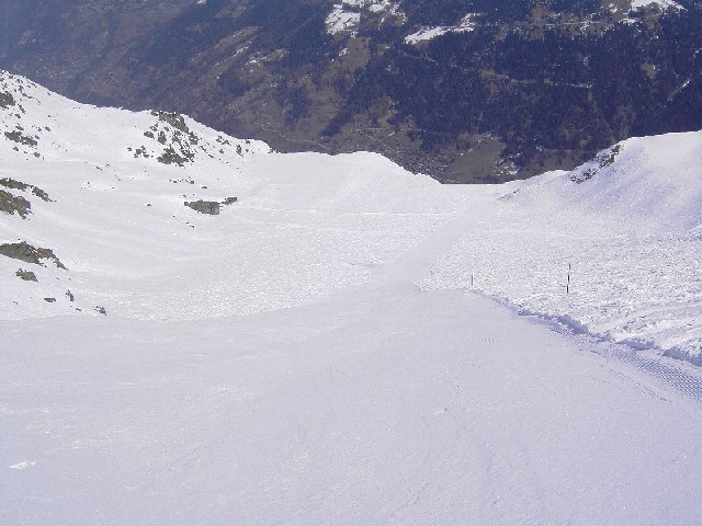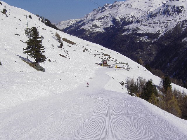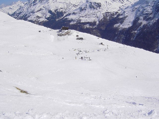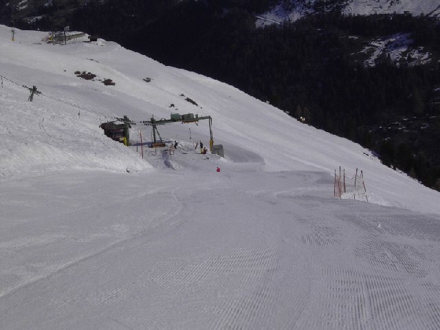 Hier starten die eher flacheren Pisten von Zinal (zwei blaue Pisten und eine rote Piste), welche wieder zur Talstation des Skiliftes „Combe“ auf Sorebois führen.