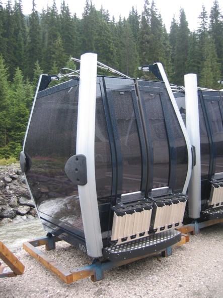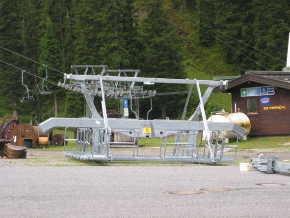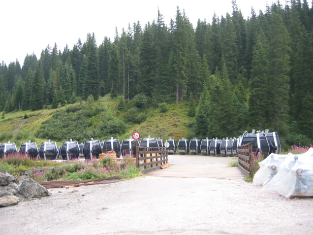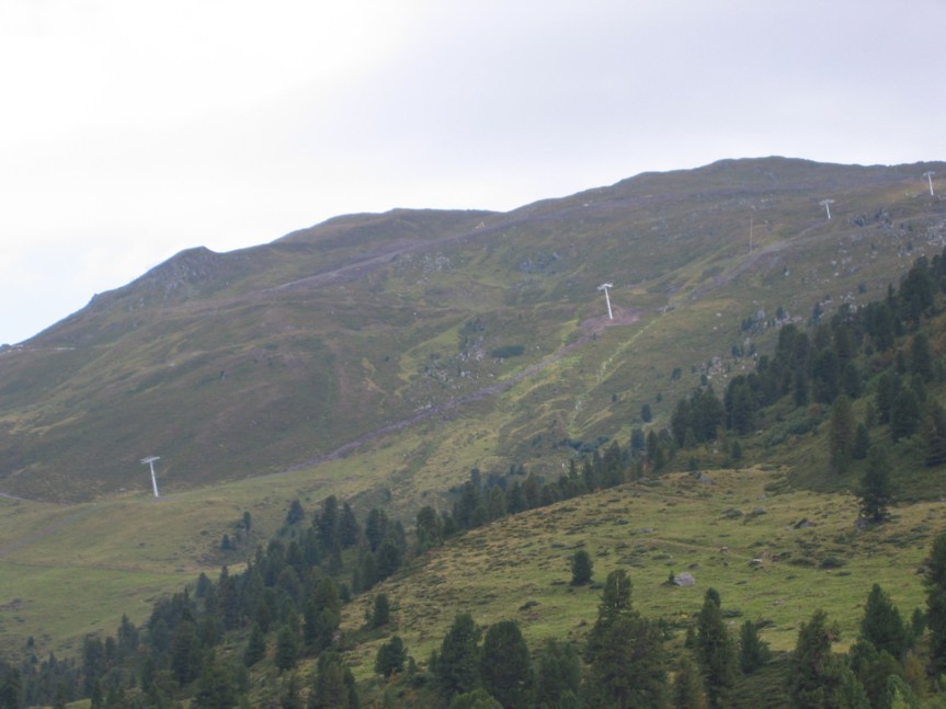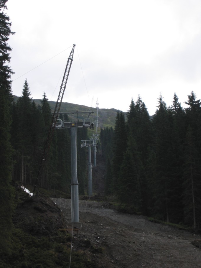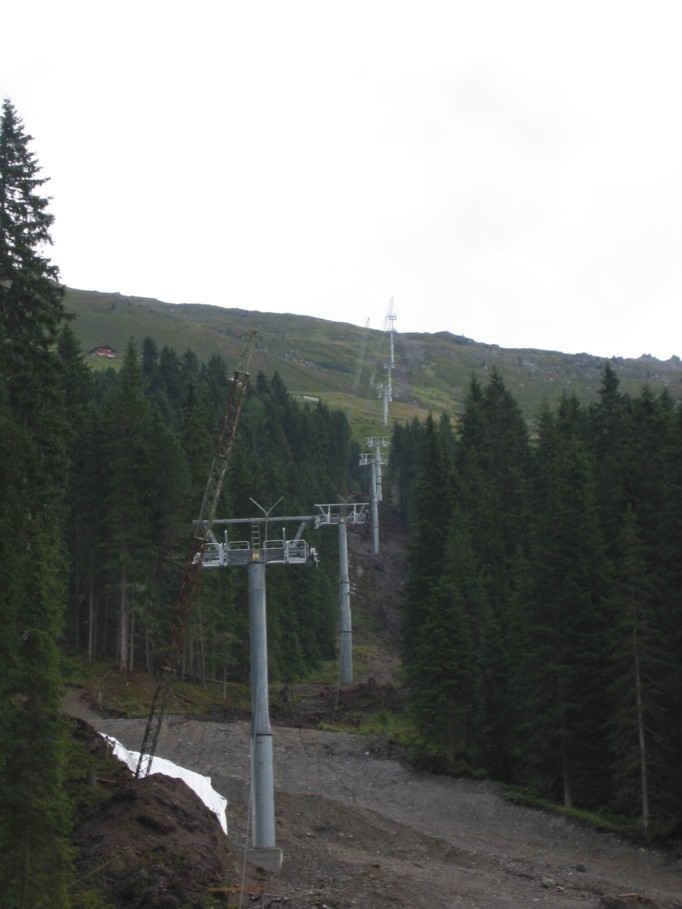 Am Samstag machte uns allerdings das Wetter einen Strich durch die Rechnung, den ganzen Vormittag regnete es in Strömen, wir standen deshalb etwa eine Stunde mit dem Auto auf dem Parkplatz in Hochfügen und machten Brotzeit und hörten Musik. Erst gegen 12 Uhr mittags hatte es soweit aufgehört, dass wir aufbrechen konnten und uns zunächst die Talstation der 8EUB Marchkopf (eigentlich Zillertal-Shuttle) angeschaut haben, die ziemlich fertig ist. Im gesamten Bereich davor sind außerdem die Kabinen der Bahn aufgereiht, ein merkwürdiges Bild! Es handelt sich um Diamond-Kabinen von Sigma, die selben, welche auch in Gerlos am Isskogel zum Ein-satz kommen. Von Außen wirklich nicht hübsch, schade, dass es keine CWA Omega III geworden sind! Aus der Nähe betrachtet machen die Diamond-Kabinen aber einen besseren Eindruck: sehr hoch (man sollte darin stehen können), eine ganze Menge Platz. Die Antriebseinheit der EUB steht anscheinend an der Bergstation, an der Talstation war nichts dergleichen zu erkennen, die Garagierung wird im Kellergeschoss Platz finden. Die Stützen der EUB sind bis auf die beiden Stützen 1A und 1B direkt an der Talstation alle montiert. Die beiden ersten Stützen stehen wohl deshalb noch nicht, weil sie sonst den Zufahrtsweg nach oben blockieren würden. Wir sind dann noch zum neuen Pistenabschnitt marschiert, der von unten ein Bild der Verwüstung bietet. Weiter oben ist aber bereits wiederbegrünt worden, was sehr zivil aussieht. Im unteren Bereich ist das noch nicht geschehen, weshalb es sehr nach Mondland-schaft aussieht. Die Pistenbreite wird sehr großzügig, bei gleichzeitiger Steilheit si-cherlich interessant zu fahren, sollten etwa 200 Hm sein, bis zur Einmündung in die Holzalm-Piste 1. Auch die Skibrücke ist sehr großzügig bemessen, zu Engpässen sollte es hier nicht kommen. Von der Talstation der Shuttle-EUB gibt es eine Art Ziehweg hinunter zur 8EUB Hochfügen, so dass diese Verbindung problemlos sein wird. Dank der neuen Waldschneise wird auch die Verbindung zur Holzalm in beiden Richtungen nun ohne Fußmärsche zu bewältigen sein, aber dazu später.