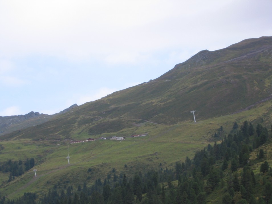 Nun aber zur eigentlichen Bergtour: auf dem Almfahrweg, der im Winter als beleuchtete Rodelbahn genutzt wird ging bei nun trockenen und zunehmend sonnigen Wetter hinauf zum Pfundsalm Nieder- und Mittelleger (1830 m), nie sehr steil, angenehm zu gehen, vom Skigebiet sieht man bald nicht mehr viel, nur die neue Trasse hinauf zum Marchkopf natürlich, die aber recht diskret ausfällt (zwar recht hohe Stützen, dazwischen aber ziemlich große Spannfelder). Der Talschluss des Finsinggrundes ist also ein sehr idyllisches Stück Landschaft. Ich schreibe explizit nicht unberührt, denn die Almwirtschaft hat hier massive Spuren hinterlassen (diverse Fahrwege, Hüttensiedlungen, Fahrzeuge). Der Charakter der Tuxer Voralpen wird für die erstmaligen Besucher (im Sommer) bald deutlich: hohe, bis zu den Gipfeln bewachsene Schieferberge mit steilen, teilweise idealen Hangneigungen. Man glaubt gar nicht wie viele verschiedene Grün-Schattierungen der Farbentopf der Natur aufweist, bis man hier gewandert ist. In kleinen Mulden finden sich oft Miniatur-Seen, die einen sehr reizvollen Kontrast bieten. Erst knapp unterhalb der 2000 m-Grenze endet der Fahrweg, dann geht es kurzzeitig richtig steil hinauf zum 2127 m hoch gelegenen Sidanjoch, wo sich erstmals der Blick hinauf zum Rastkogel weitet und sich eine ausgedehnte, alpine Gras- und Mattenlandschaft ausbreitet. Zur Rastkogelhütte (2124 m, DAV Oberkochen) sind es dann nur mehr 10 Minuten, die 2 Stunden Gehzeit von Hochfü-gen sind realistisch (wenn man nicht wie wir ausgedehnte Baustellenbesichtigungen einschiebt). An der Hütte (wenig Betrieb wegen bis dahin schlechtem Wetter) gabs erst mal eine ausgedehnte Brotzeit (auf der Terrasse war es fast zu frisch zu sitzen!), auch ein luxoriöses Zimmerlager haben wir uns reserviert.