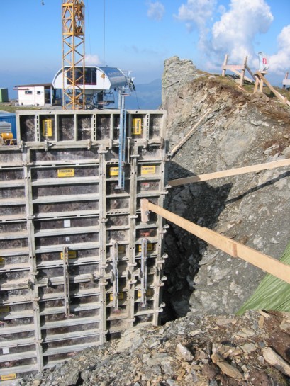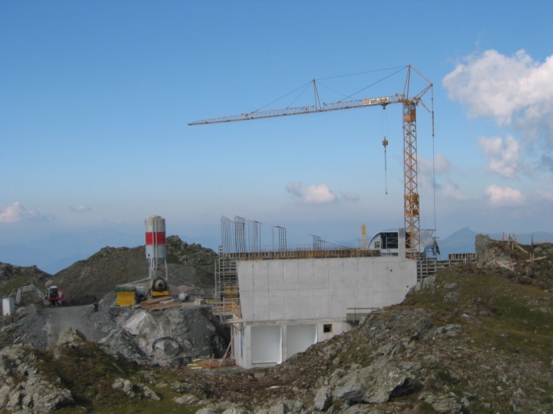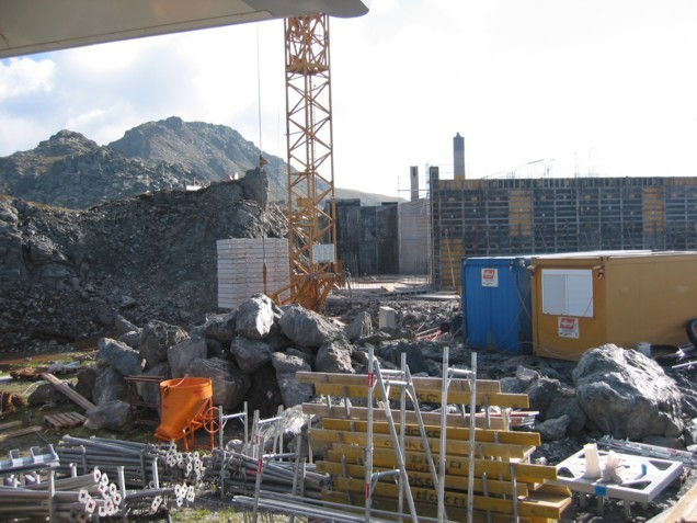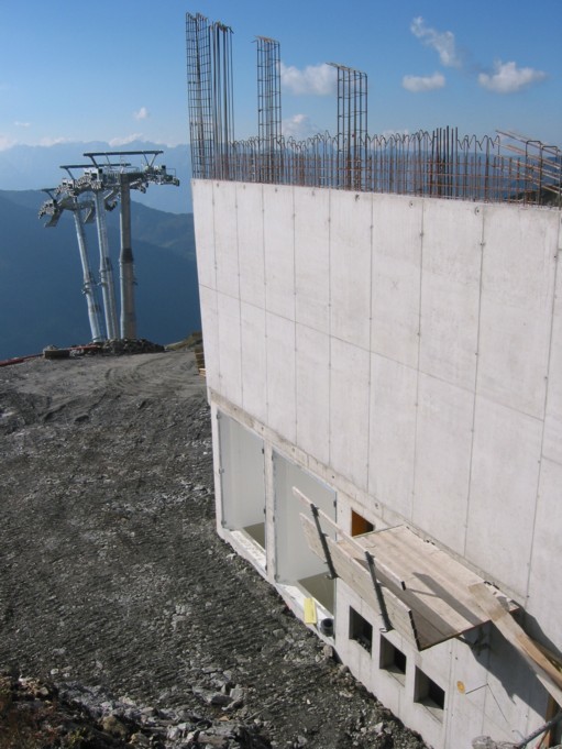 Für uns ging nun endlich die 1000 Hm nach Hochfügen hinunter, erst steil und felsig vom Marchkopf nach unten, dann musste der Hüttenkogel umgangen werden und erst dann stehen wir vor der Baustelle der Bergstation, die von oben kleiner ausgesehen hat. Allein die Stützen 13a-c haben gewaltige Dimensionen. Die Bergstation ist fast fertig betoniert, sie hat ganz schön „Tiefgang“ und ist noch nicht wieder vom Erdreich bedeckt, in ihrem Untergeschoss. Von der Seilbahntechnik ist noch absolut nichts zu sehen, das kann aber schnell gehen, wie wir wissen. An der 4KSB Marchkopf haben wir dann Probe-Sitzen in den Couch-Sesseln gemacht, genau richtig nach so einer langen Bergtour. Viel mehr zu sagen gibt’s zur Bergstation nicht, außer dass wir der Meinung sind, dass hier in Bälde wohl ein Bergrestaurant errichtet werden wird (keine Hinweise, es bietet sich aber an: tolles Panorama, lange Sonne, auch im Hochwinter).