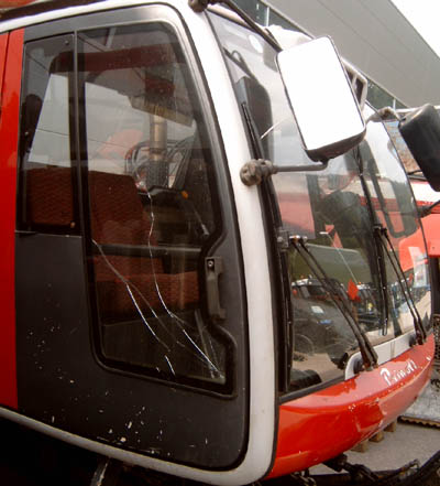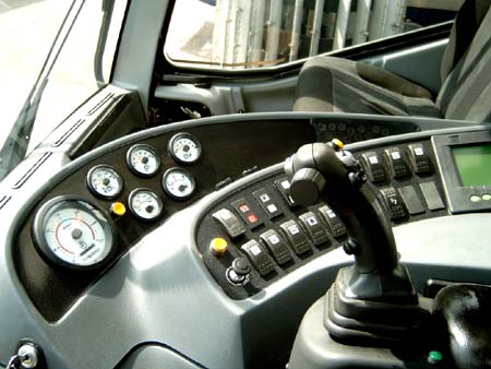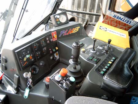 Br2000 Kabine, in Vordergrund der Joystick für der Schild.