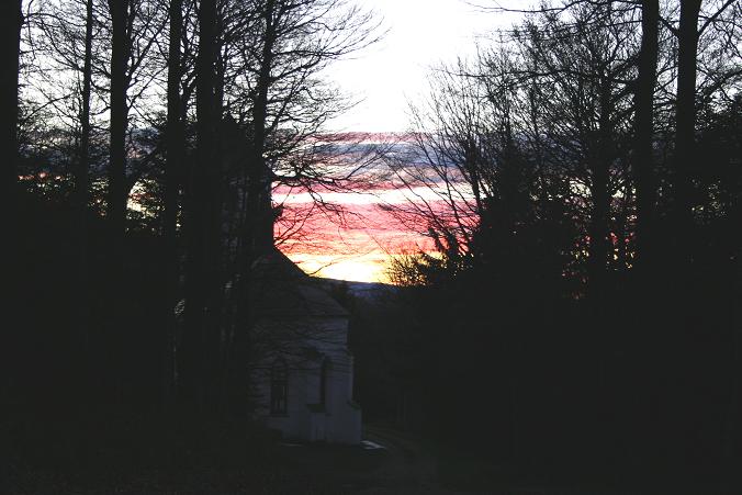 Sonnenuntergang hinter der Kirche des Hl. Bolfenk, nahe der Bergstation der Gondelbahn.