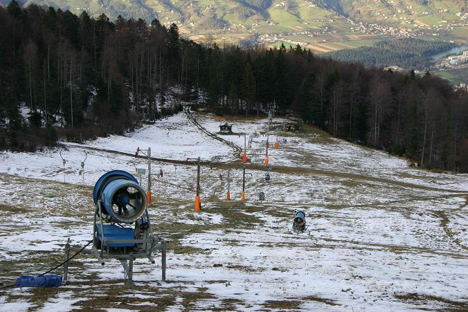 Es bleibt also nur die Hoffnung auf Schneekanonen, aber auch da schaut es nicht rosig aus: die kalten Perioden sind kurz, dann kommt schnell wieder der verdammte Südwestwind mit Plusgraden :evil: . Jetzt aber zu den Fotos: die erste Runde entstand vor genau 8 Tagen, ich habe zu Fuss das ganze Skigebiet 'inspiziert', die Kanonen am Areh standen startbereit, aber es gab noch Plusgrade.