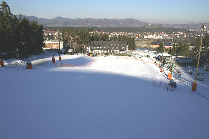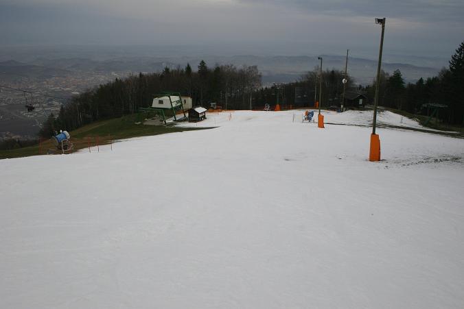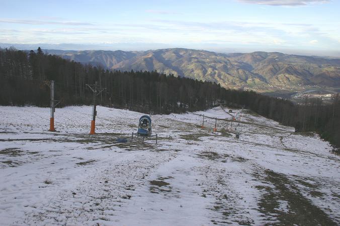 Vergleicht mal die Schneelage am DSB Sleme: hier Talstation, etwa 880 m (gerade am oberen Rand der Inversion, nachts kann man hier gerade noch beschneien) ...