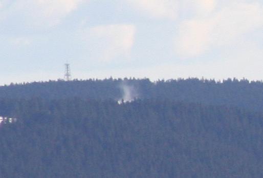 Zoom Richtung Rogla: die Pisten sind nicht zu sehen, dafür aber der Aussichtsturm und eine laufende Kanone an der bergstation des SCHL Jasa.