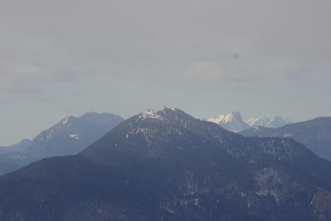 Hier waren wir 1 Tag zuvor zum Sonnenuntergang: Urslja Gora mit dem Sender, Kirche und Alpenvereinshaus.