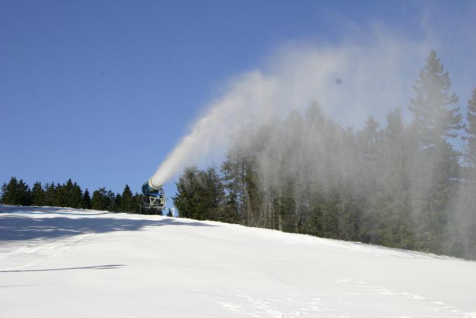 2 Kanonen beschneien die letzten 200 m der Familienabfahrt, wo ein kleiner Seillift (gratis) für die Kleinsten steht. Bei -2,5 Grad allerdings sehr nasser Kunstschnee ...